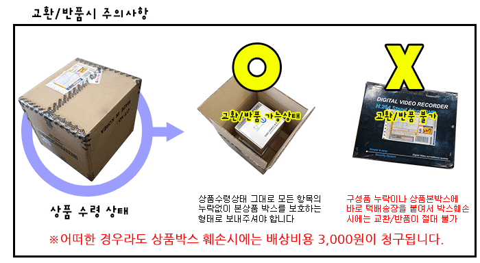 제품 교환/반품시는 박스안에 구매사이트,수령자명,교환/반품사유,연락처를 메모후 로젠택배(1588-9988)로 보내주셔야 합니다.