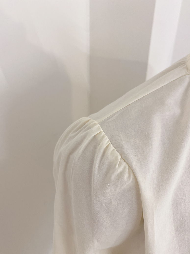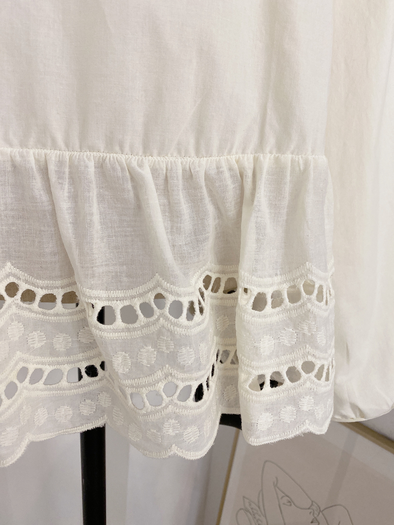 목 주변을 감싸주는 프릴넥과 밑단에 펀칭 디테일이 더해져
