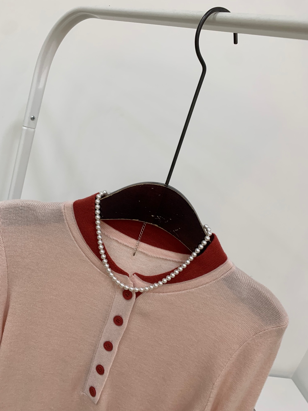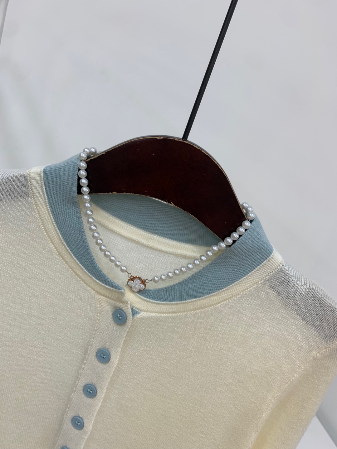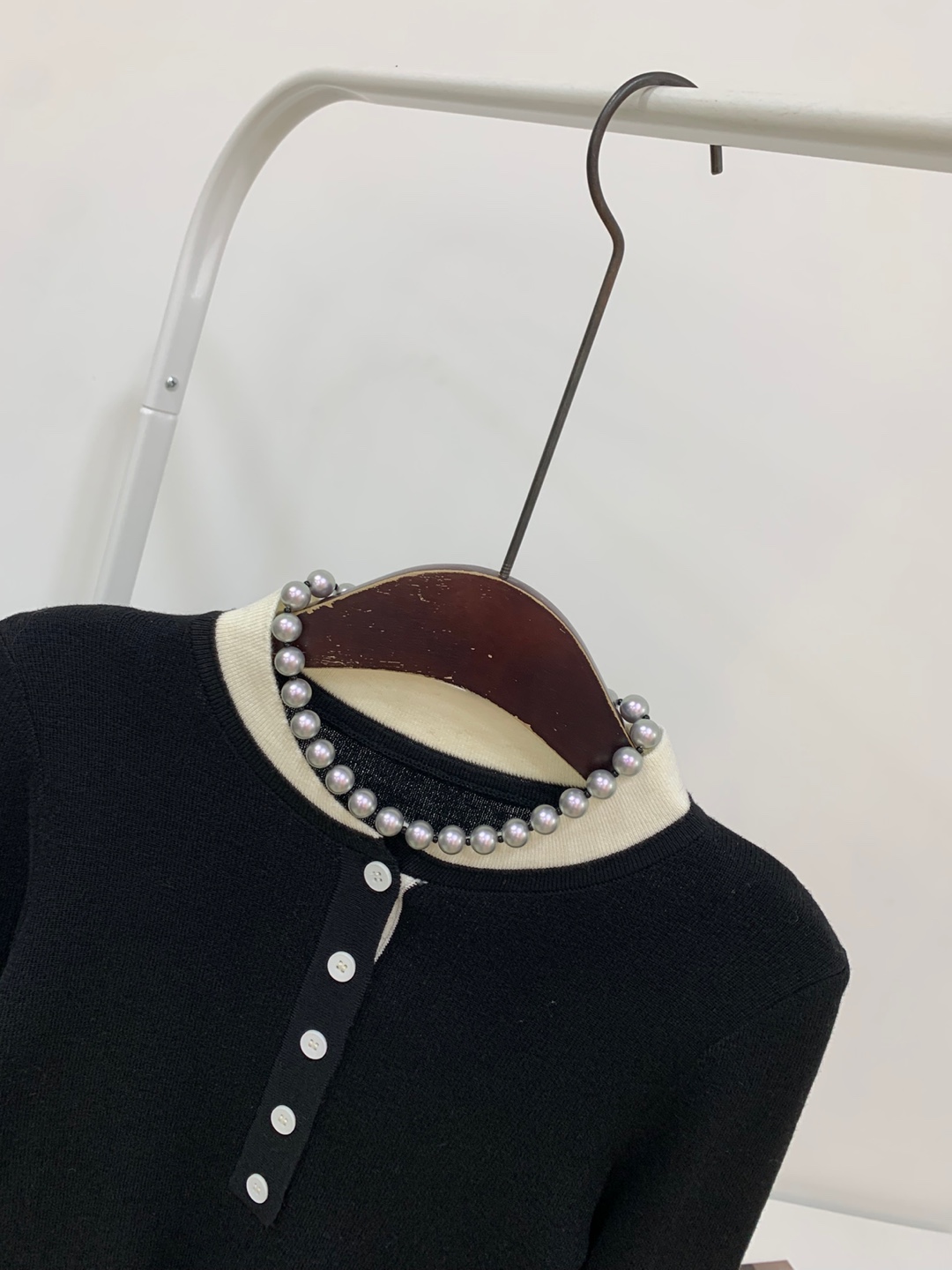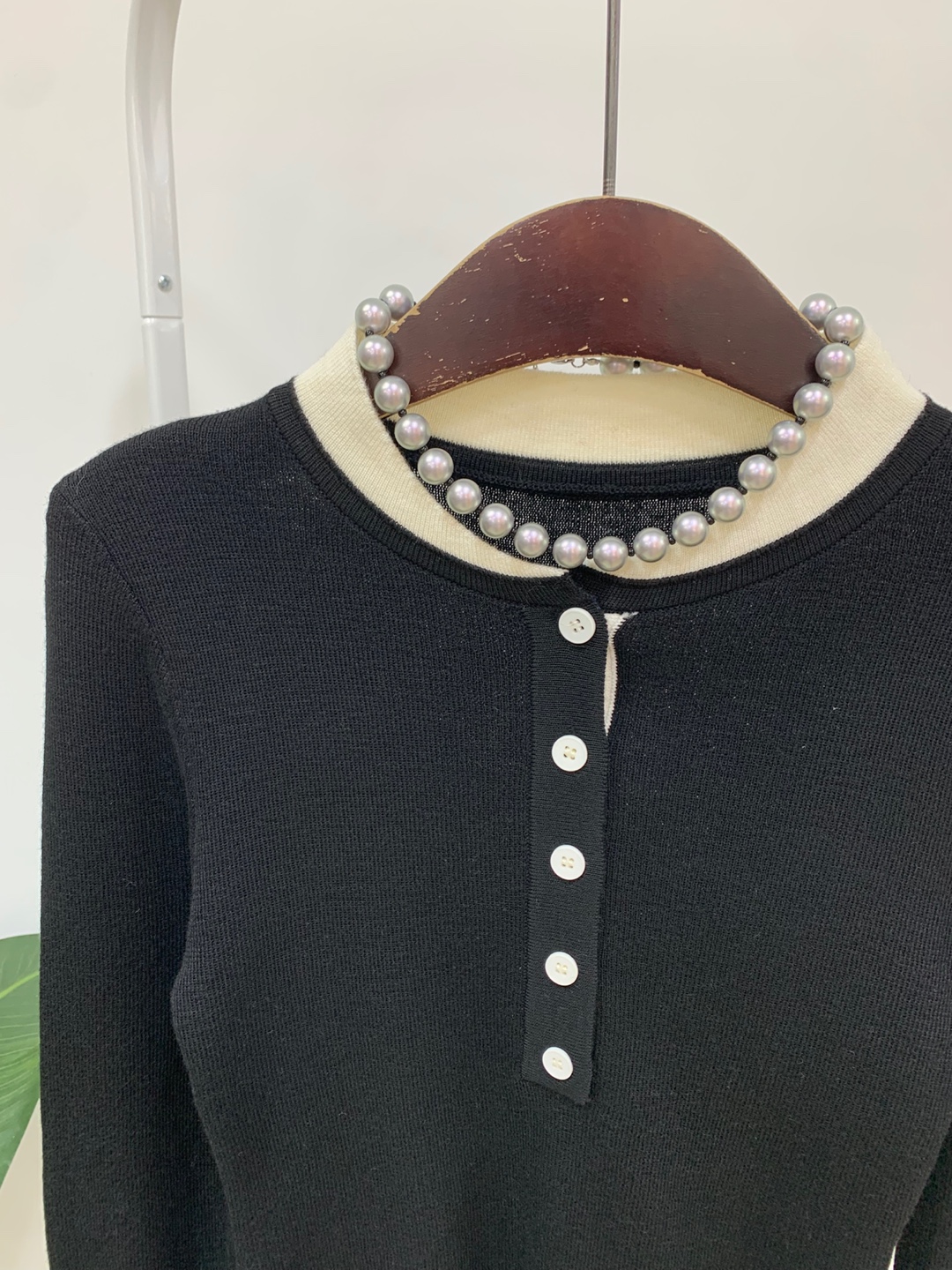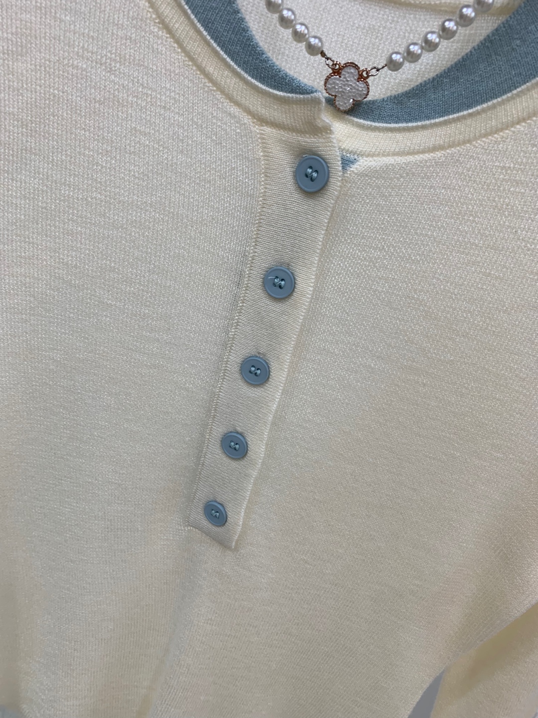 라운드넥 아래로 배색 단추를 더해