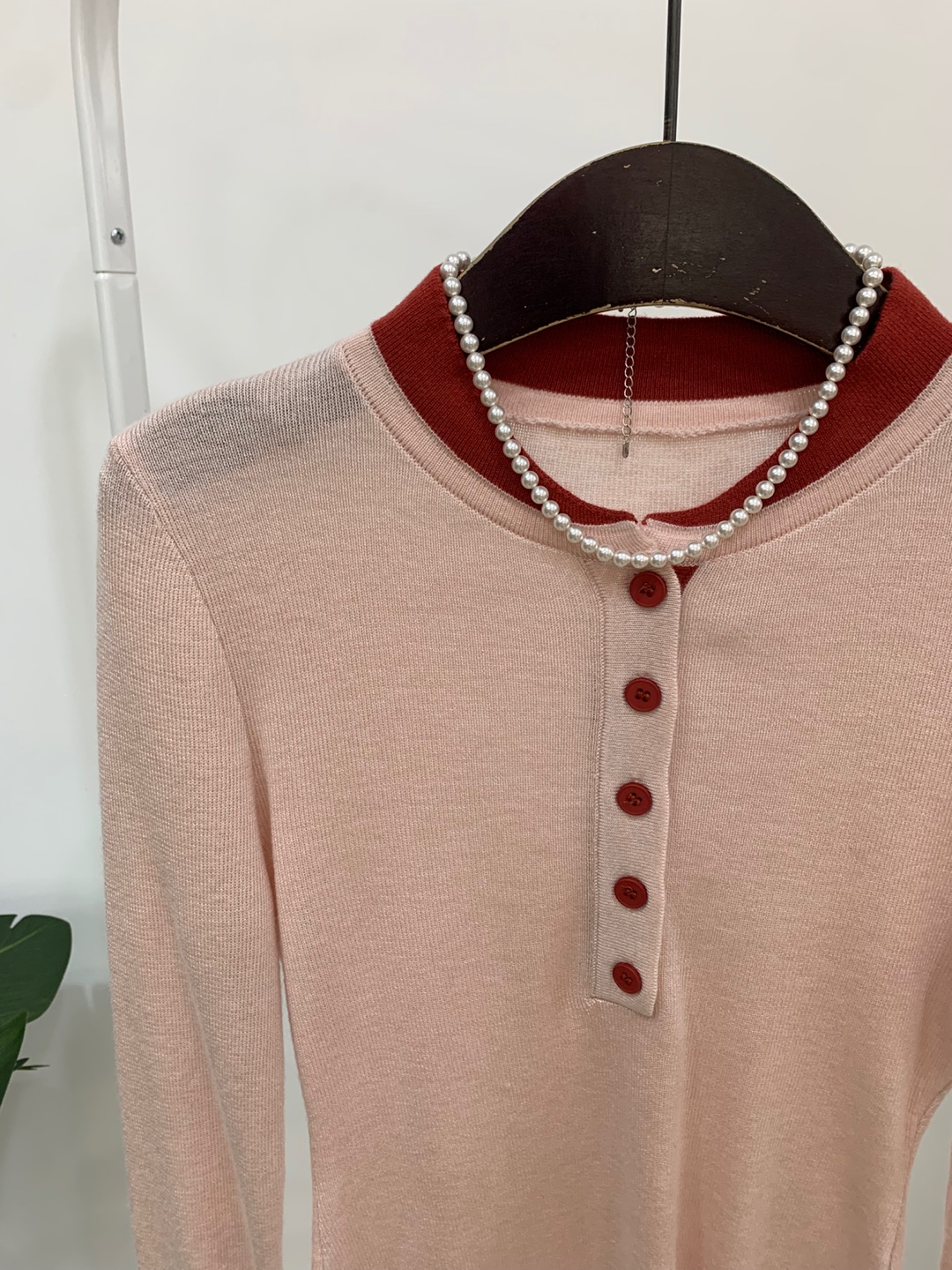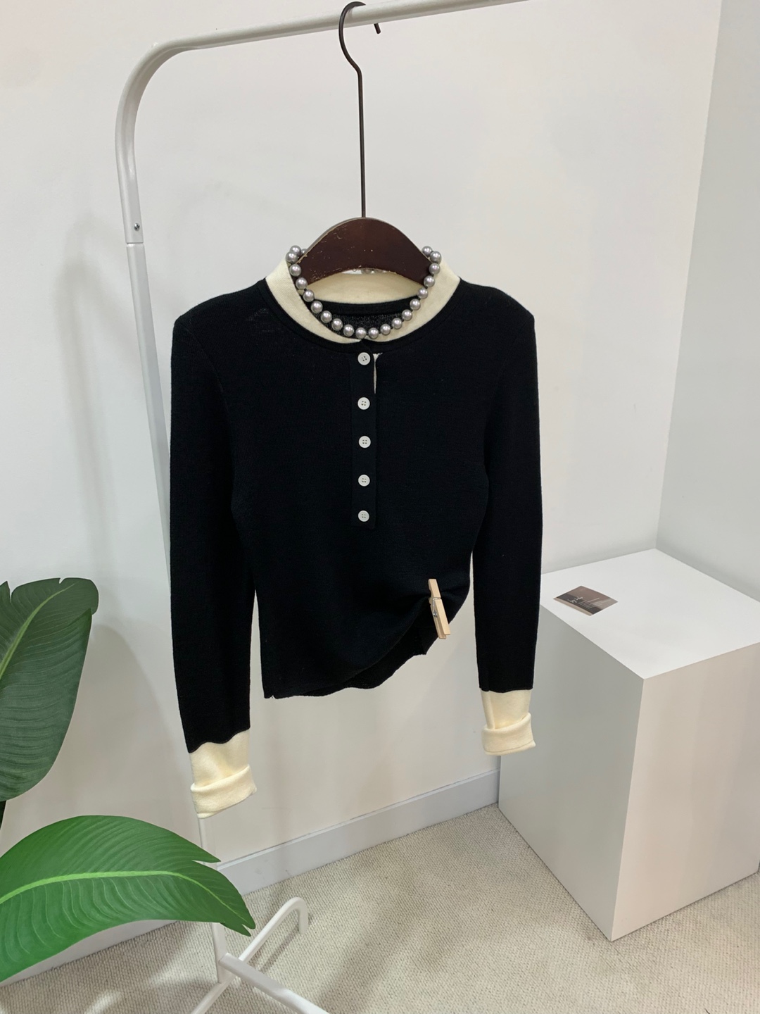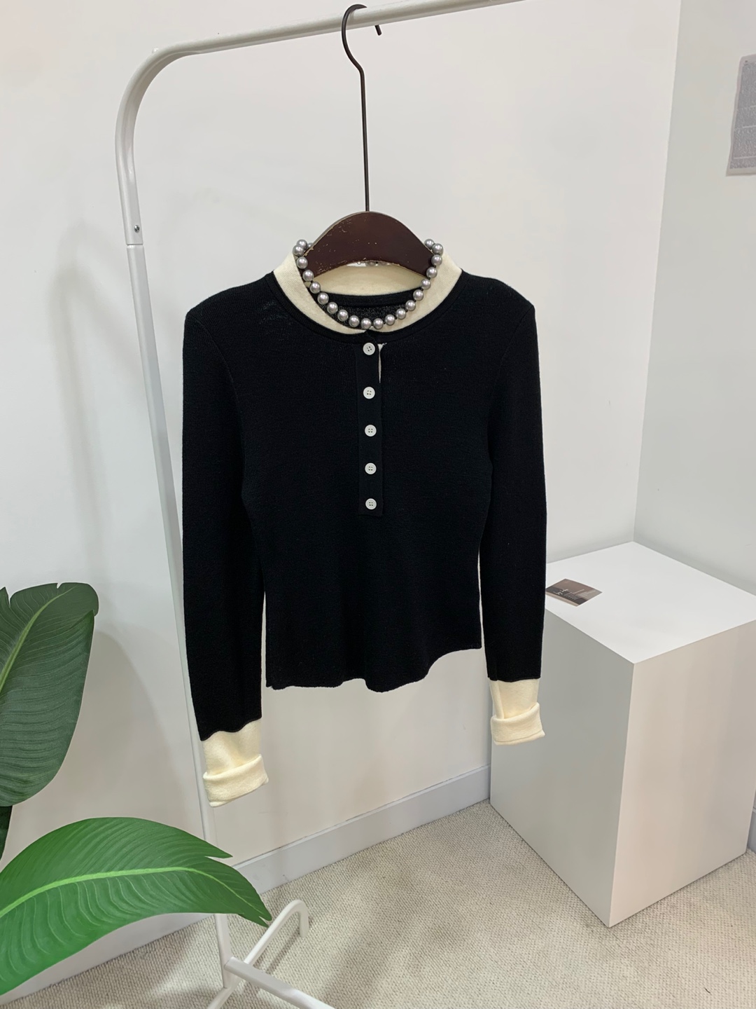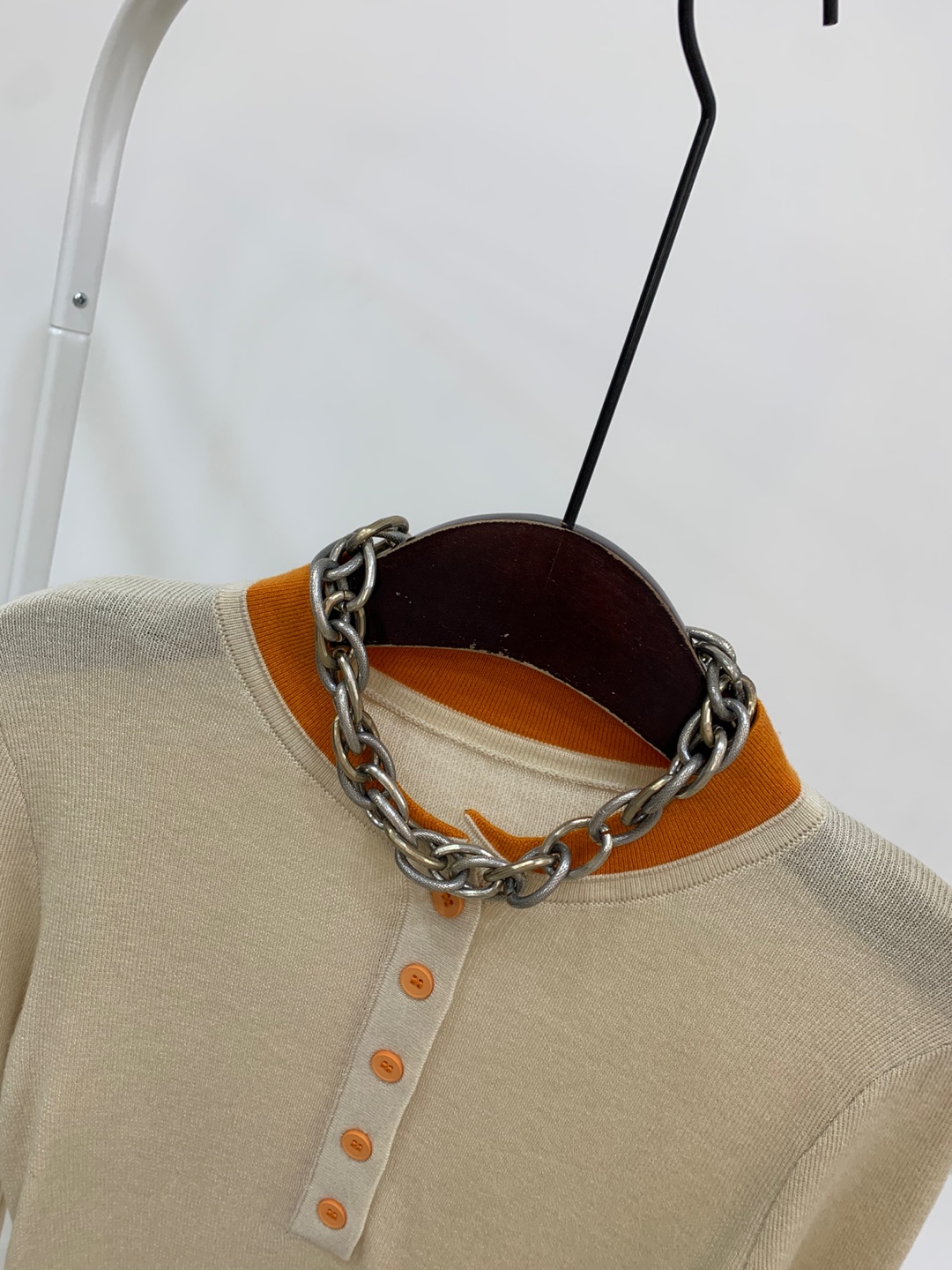 라운드넥 아래로 배색 단추를 더해