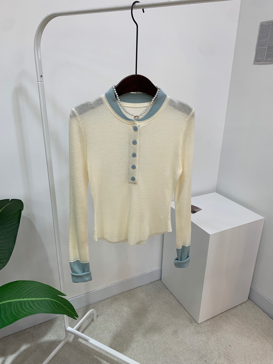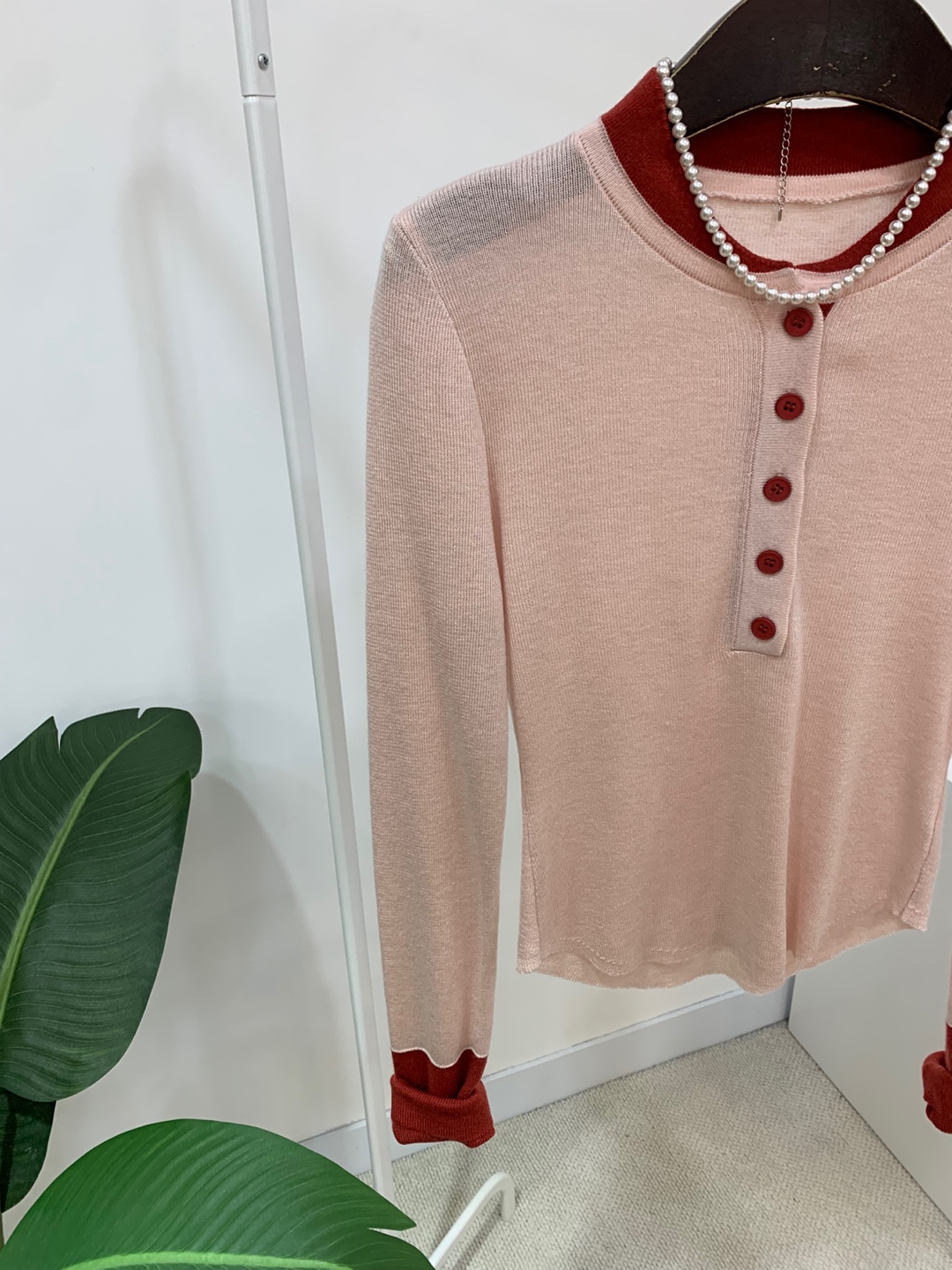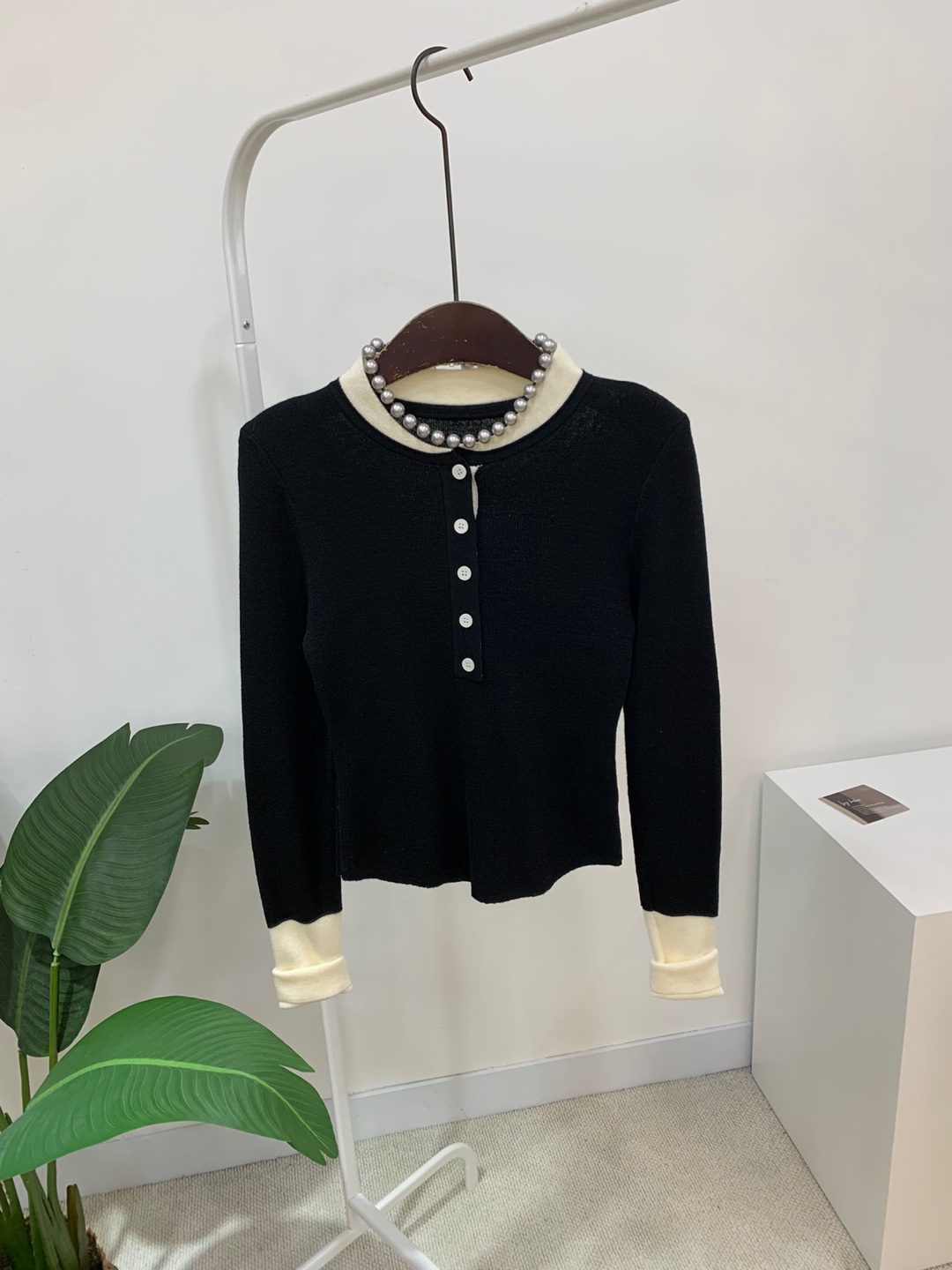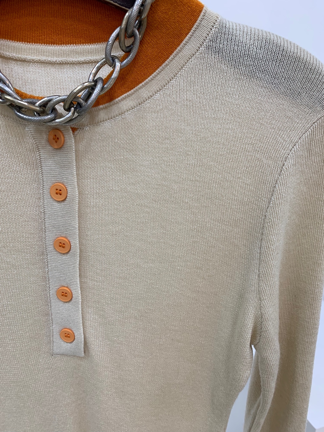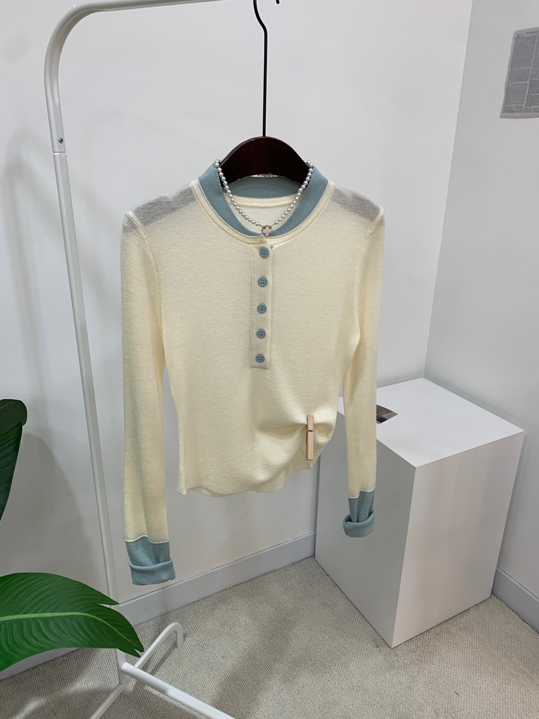 라운드넥 아래로 배색 단추를 더해