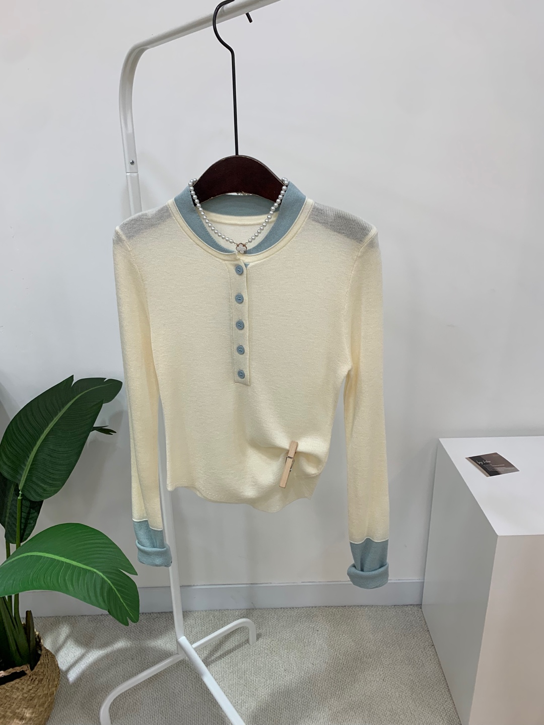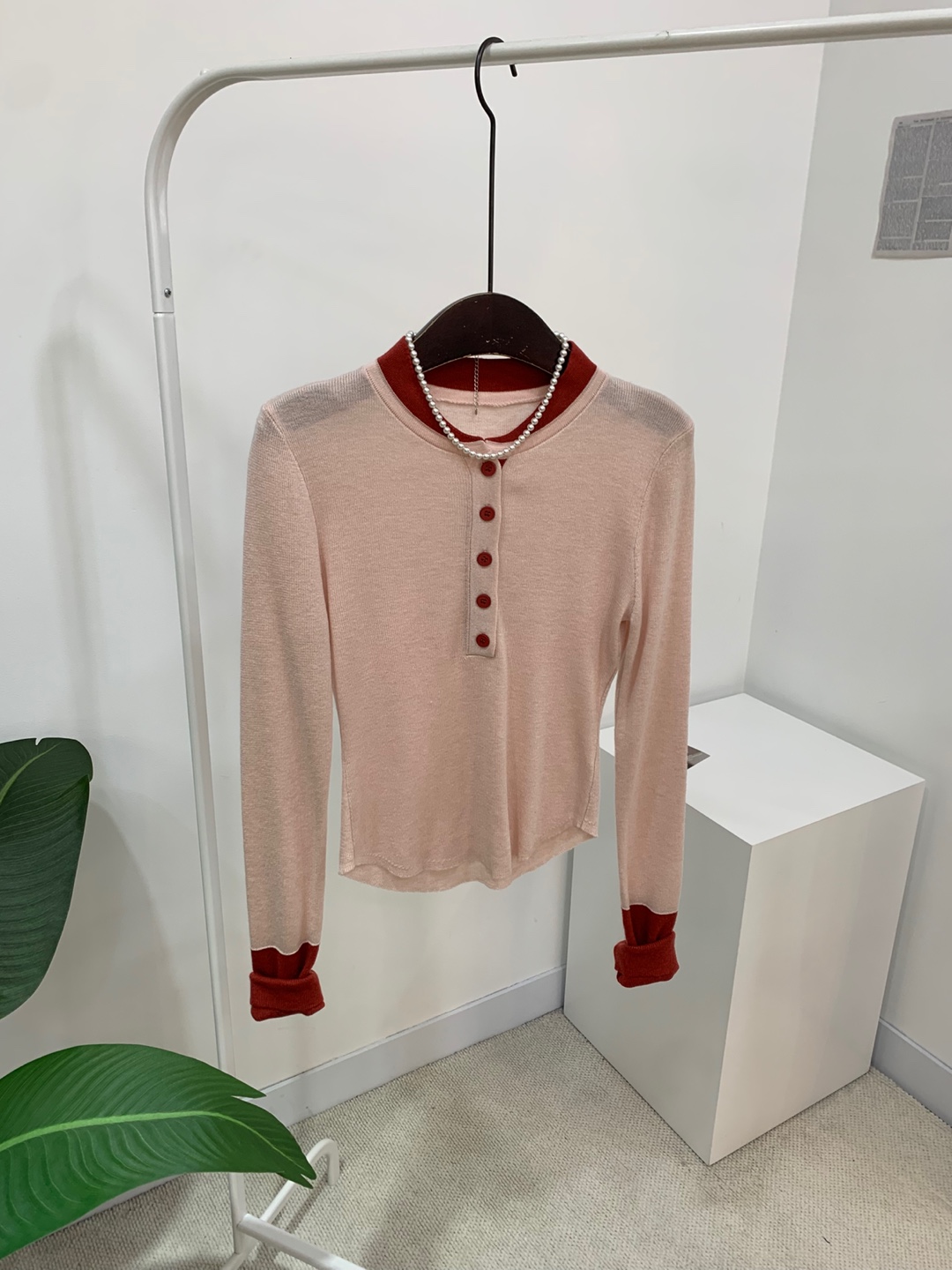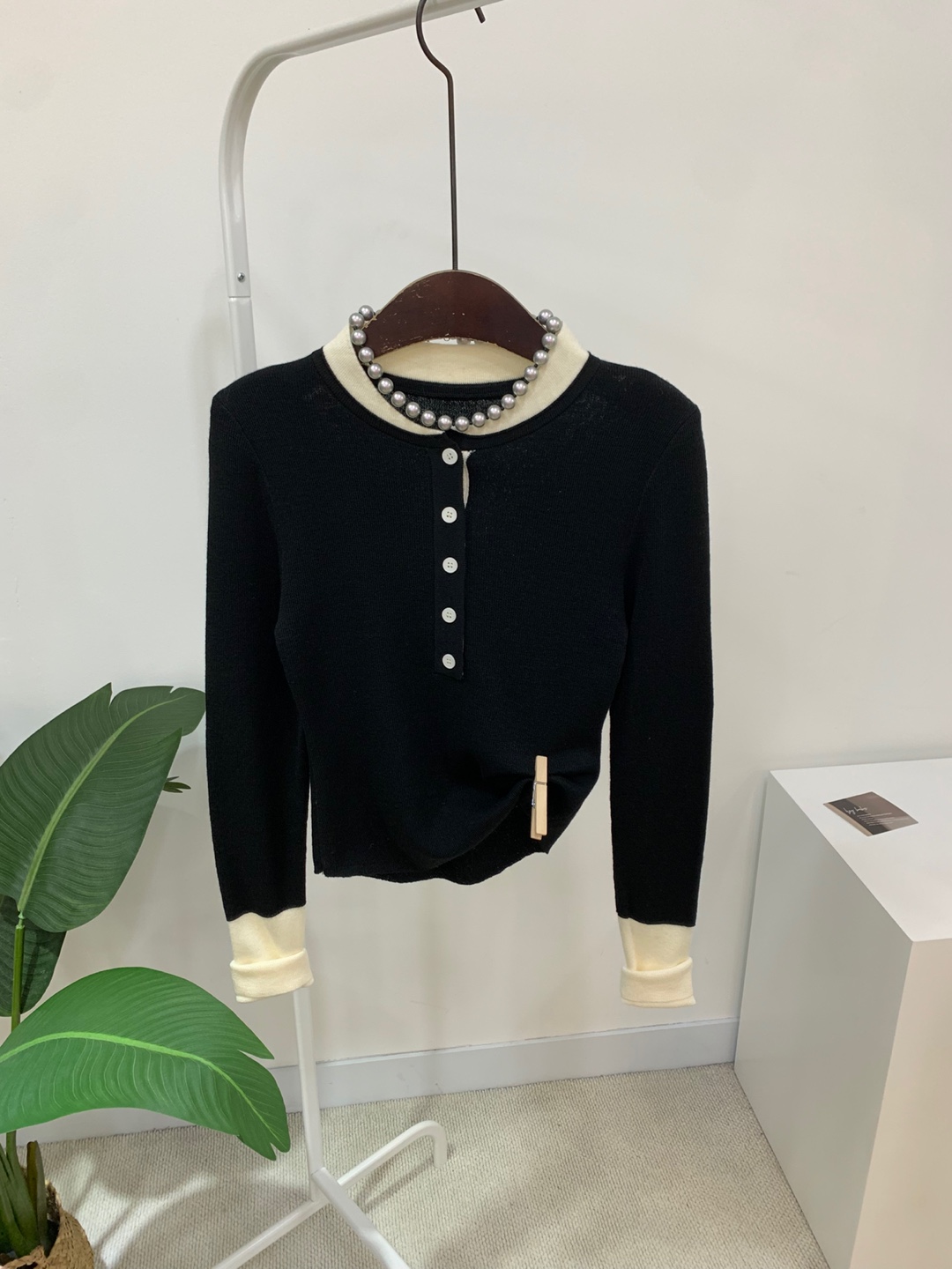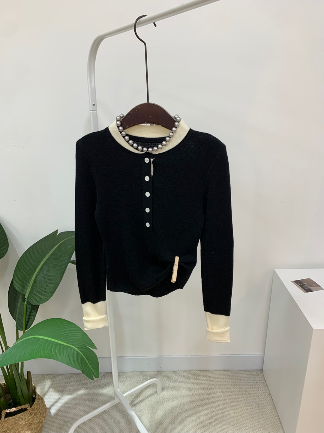 라운드넥 아래로 배색 단추를 더해