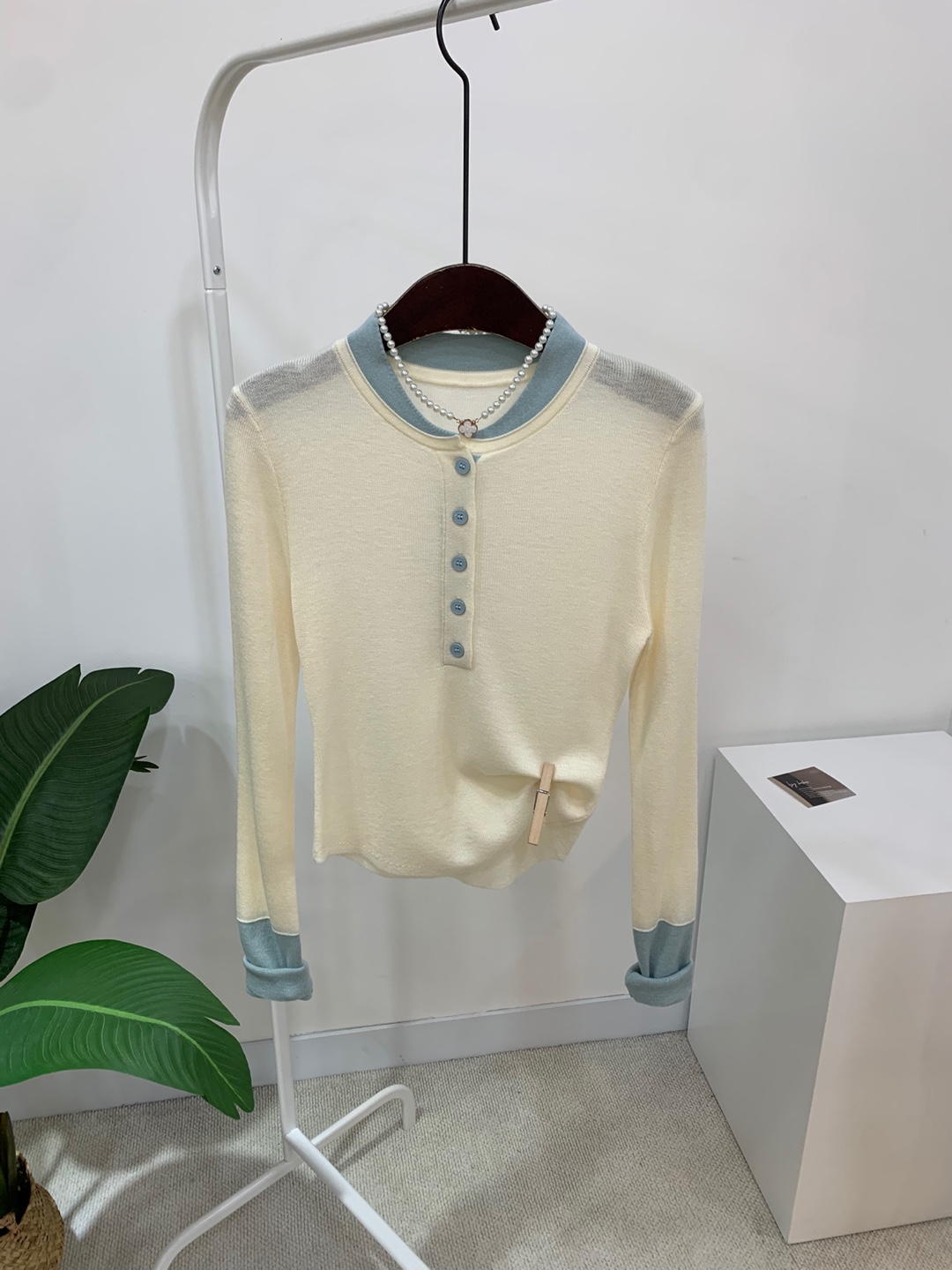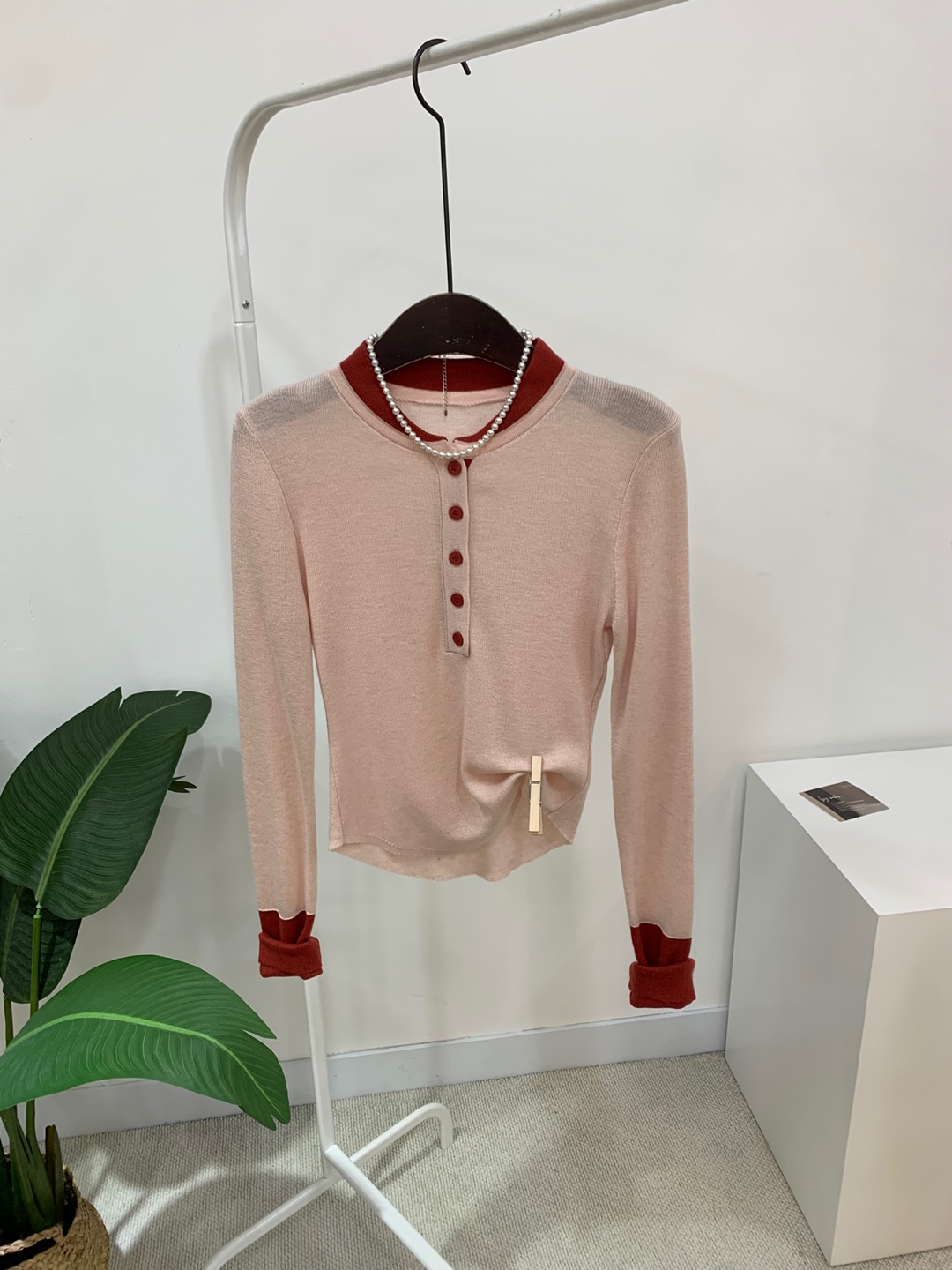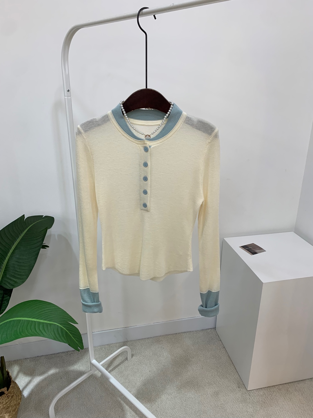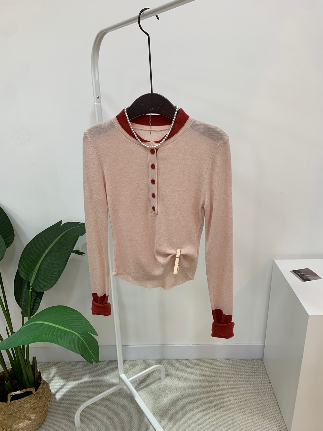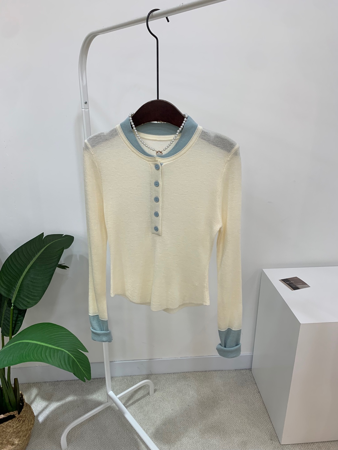 라운드넥 아래로 배색 단추를 더해