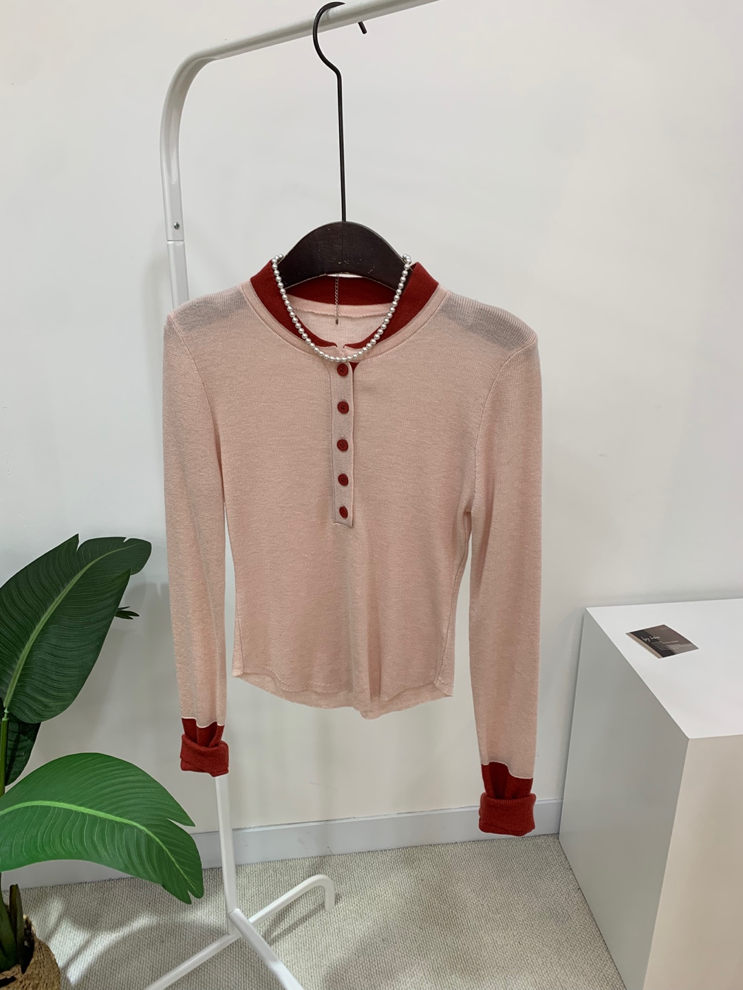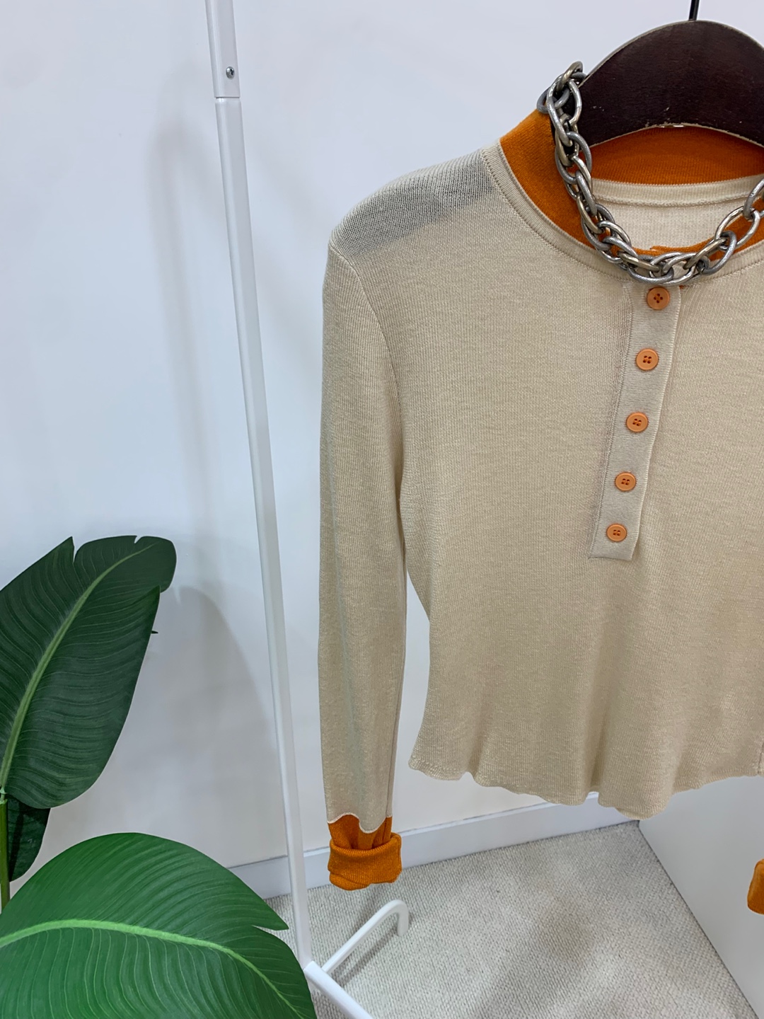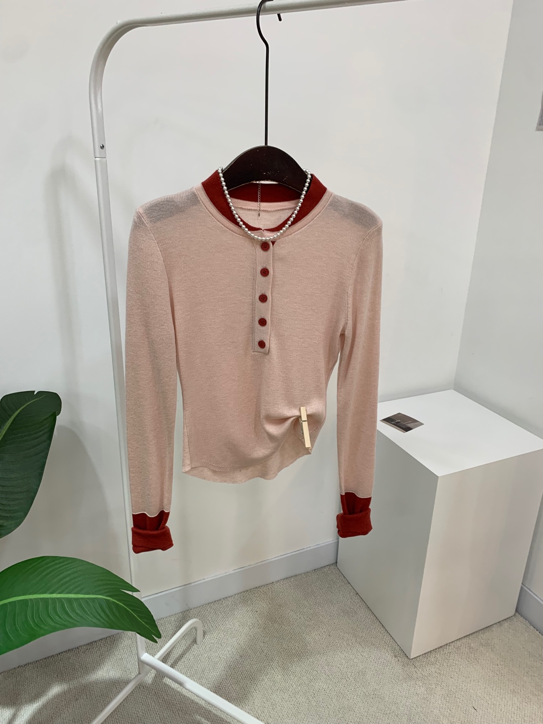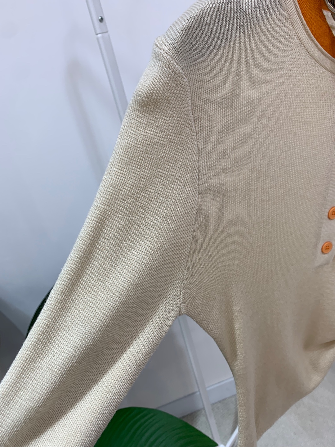 라운드넥 아래로 배색 단추를 더해
