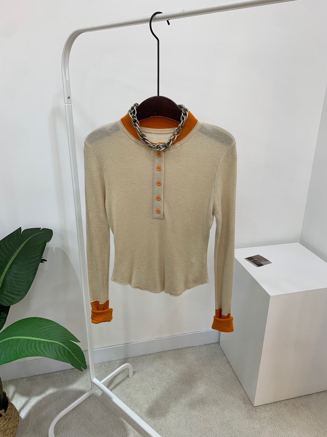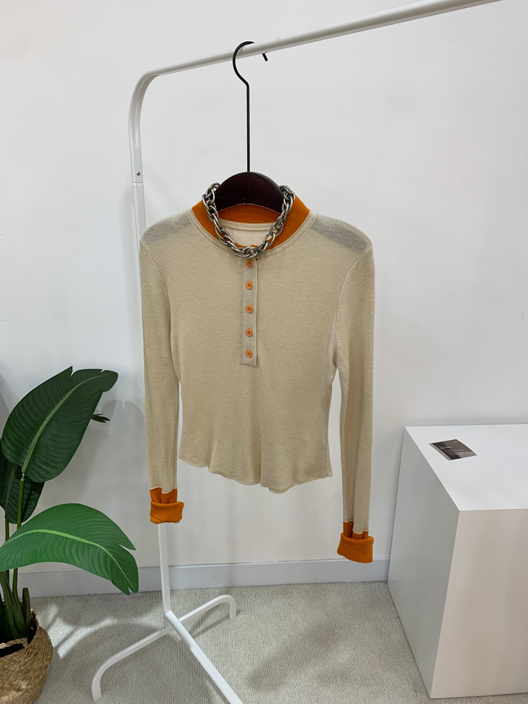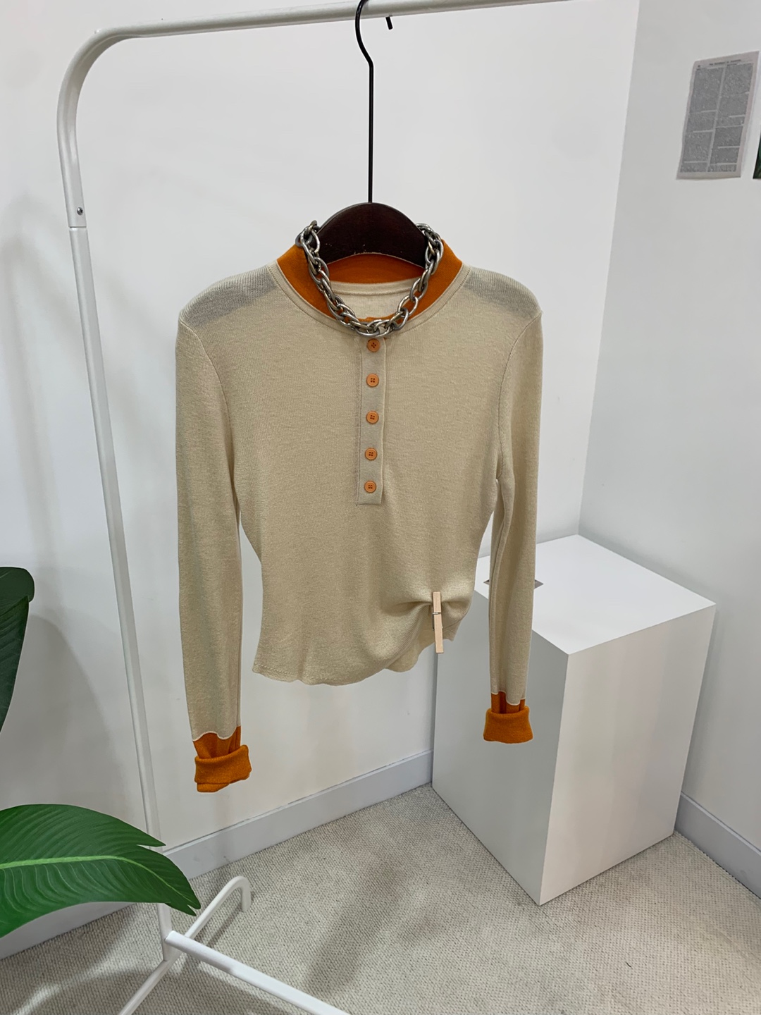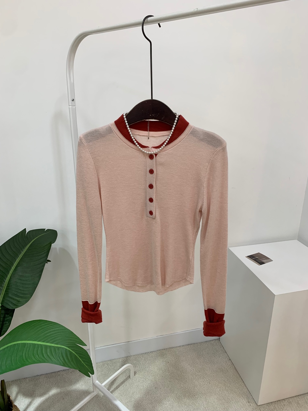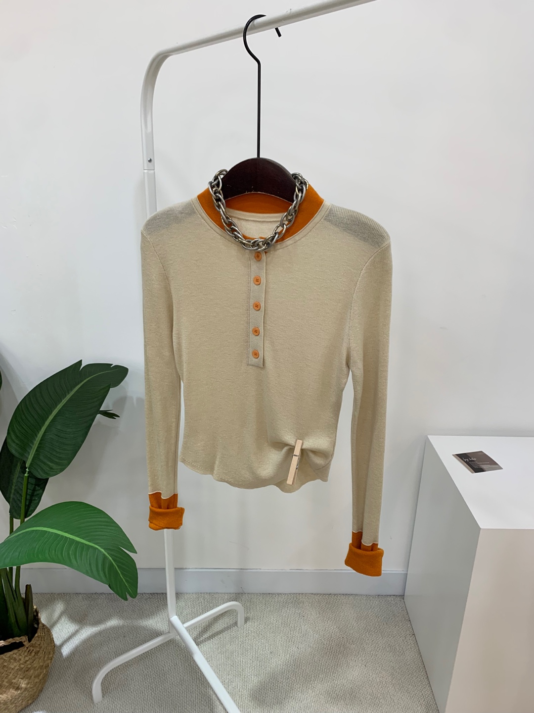 라운드넥 아래로 배색 단추를 더해
