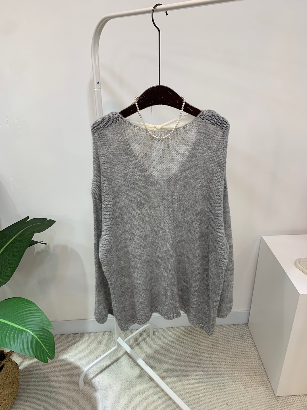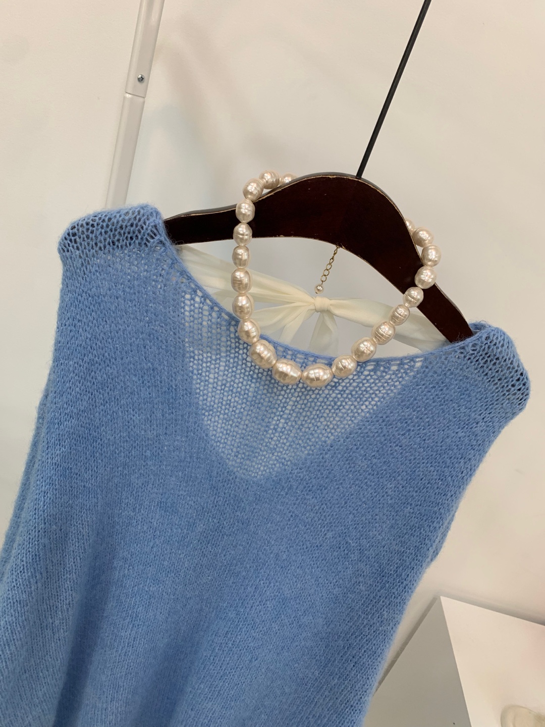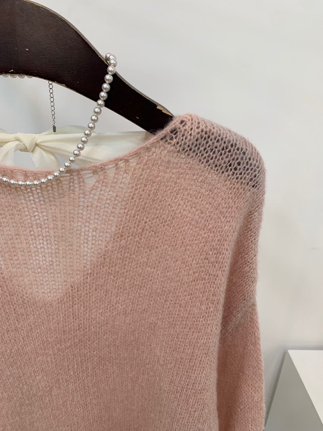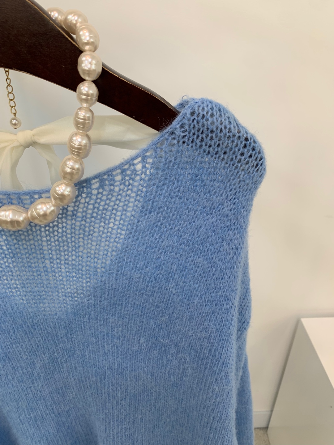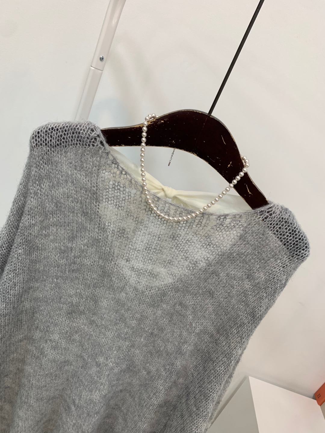와이드 넥 라인에 촘촘한 그물 패턴의