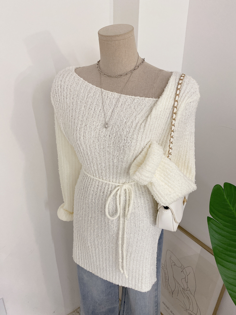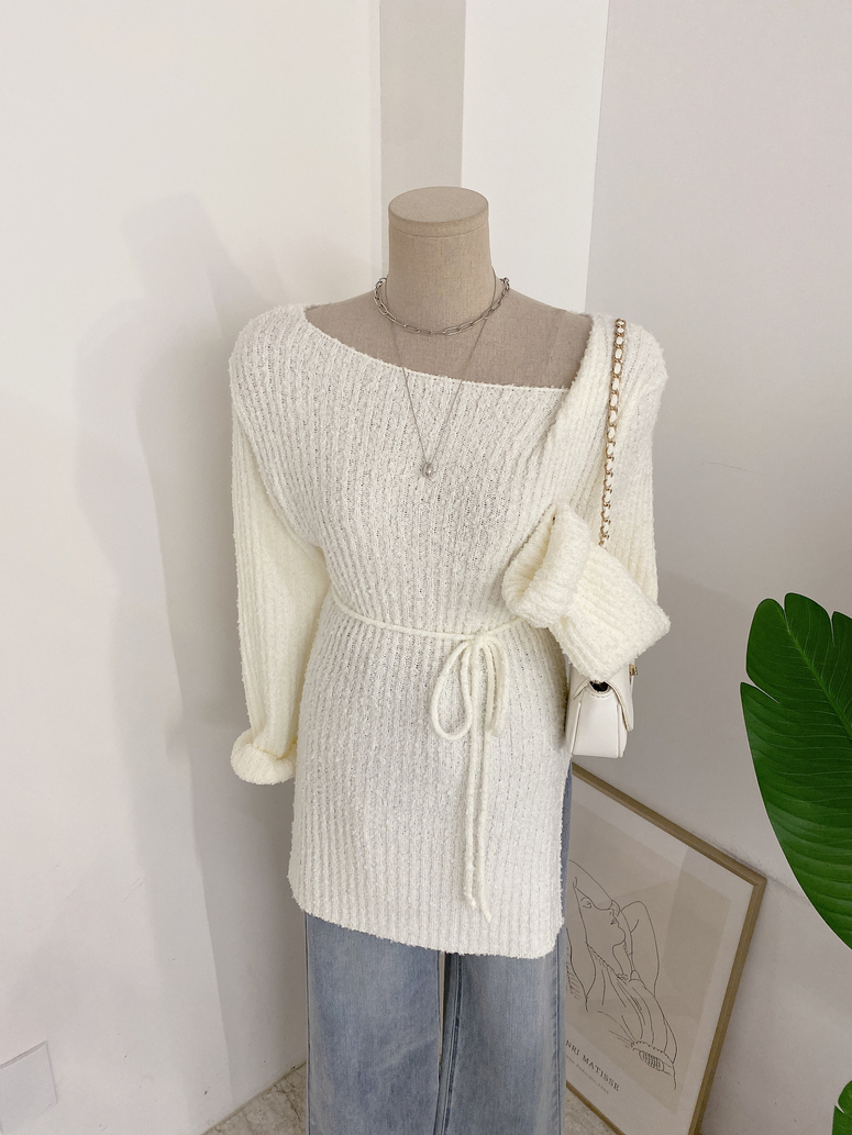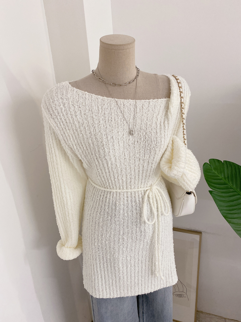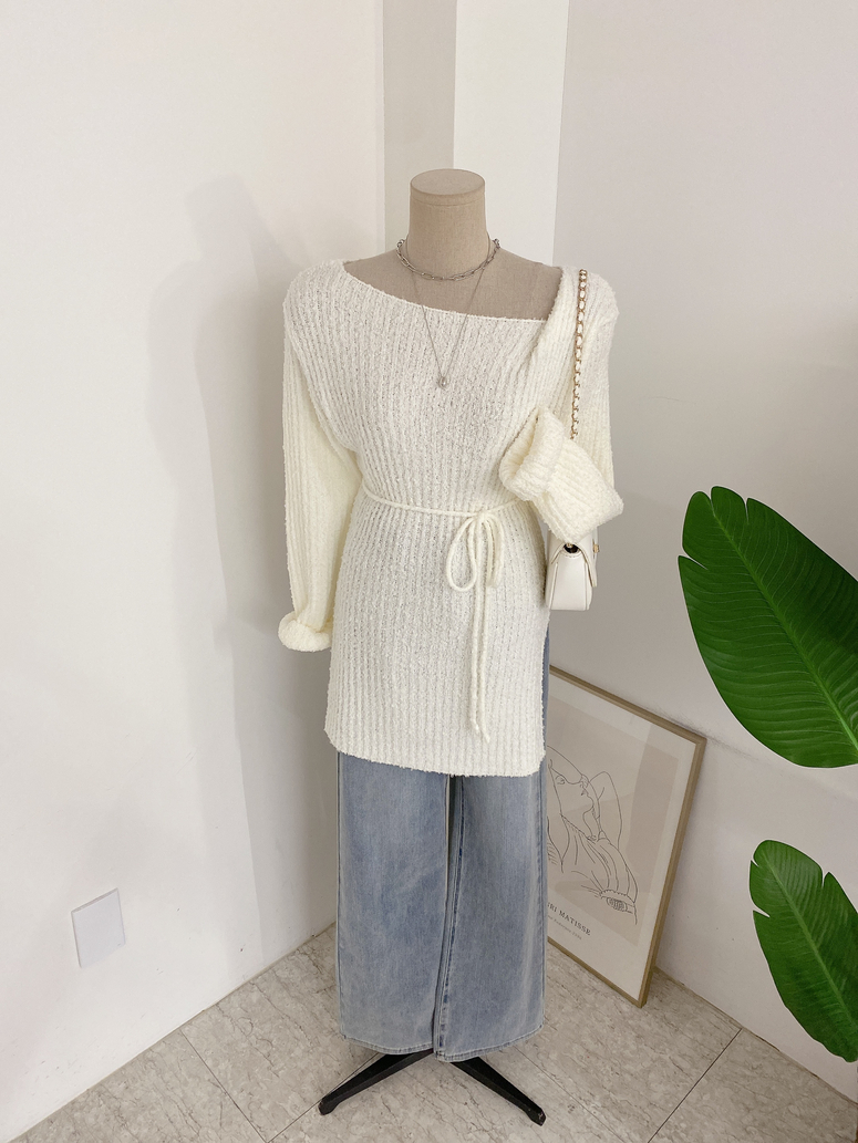 은은하게 쇄골이 보이는 보트넥 디자인으로 여성스러운 무드를 선사하며