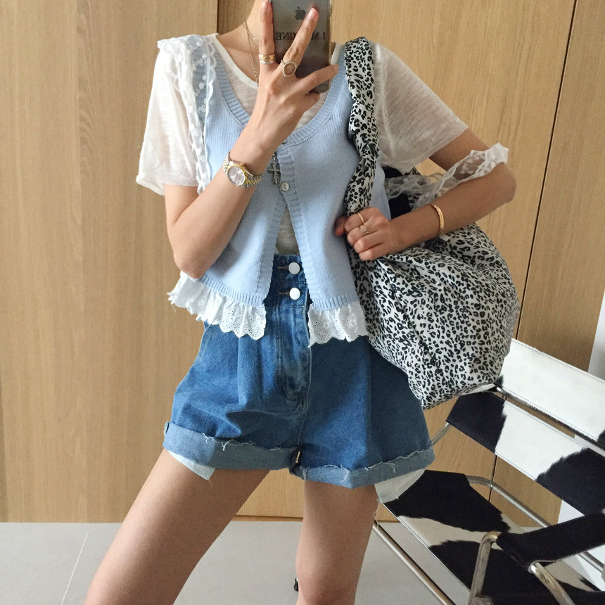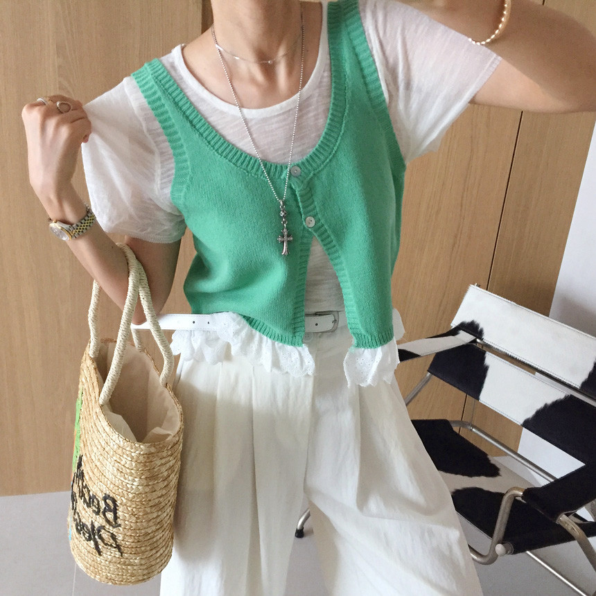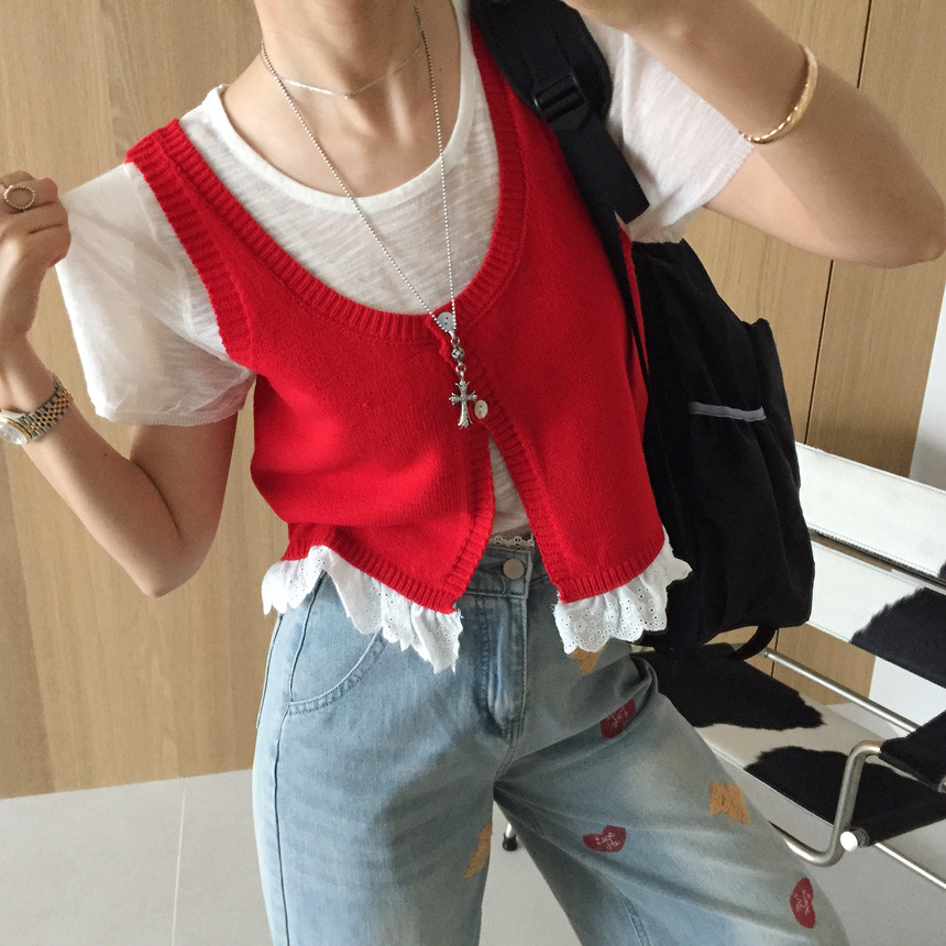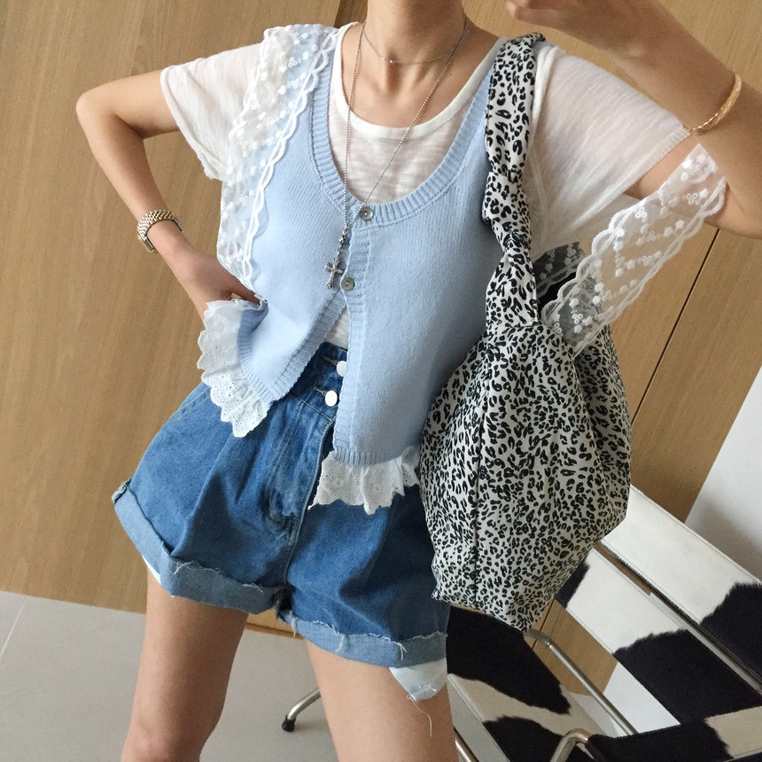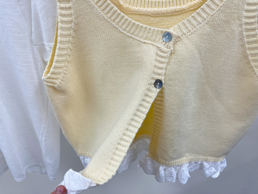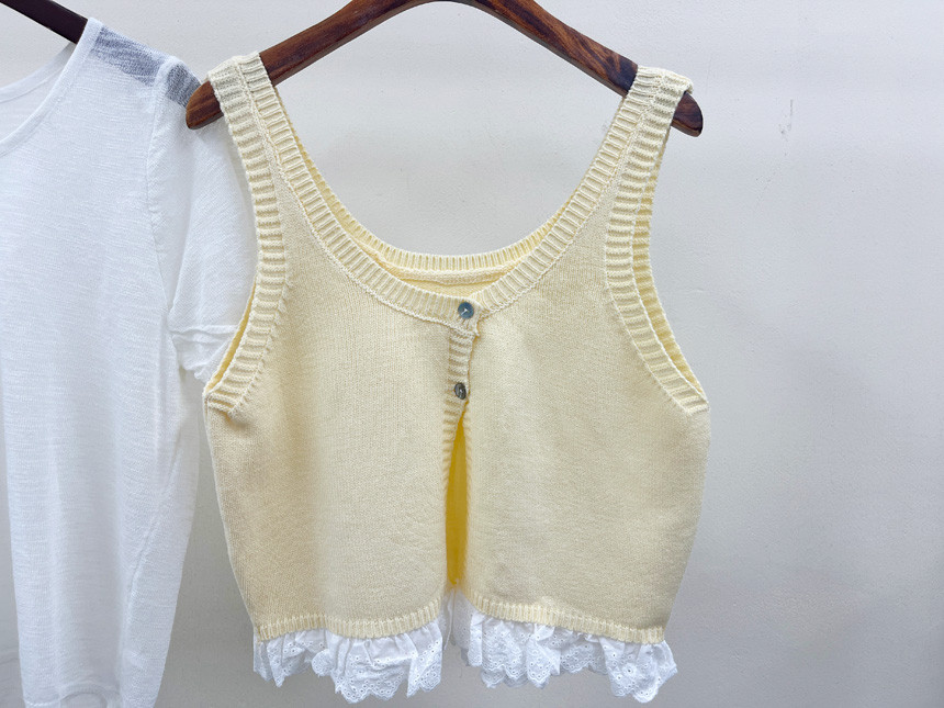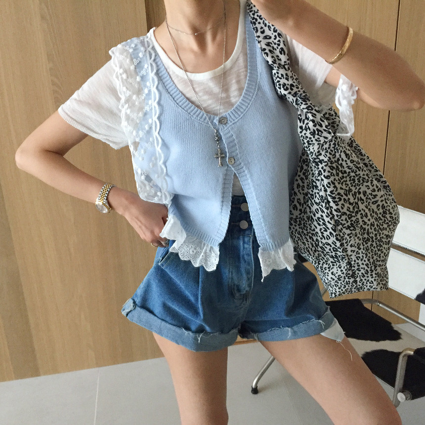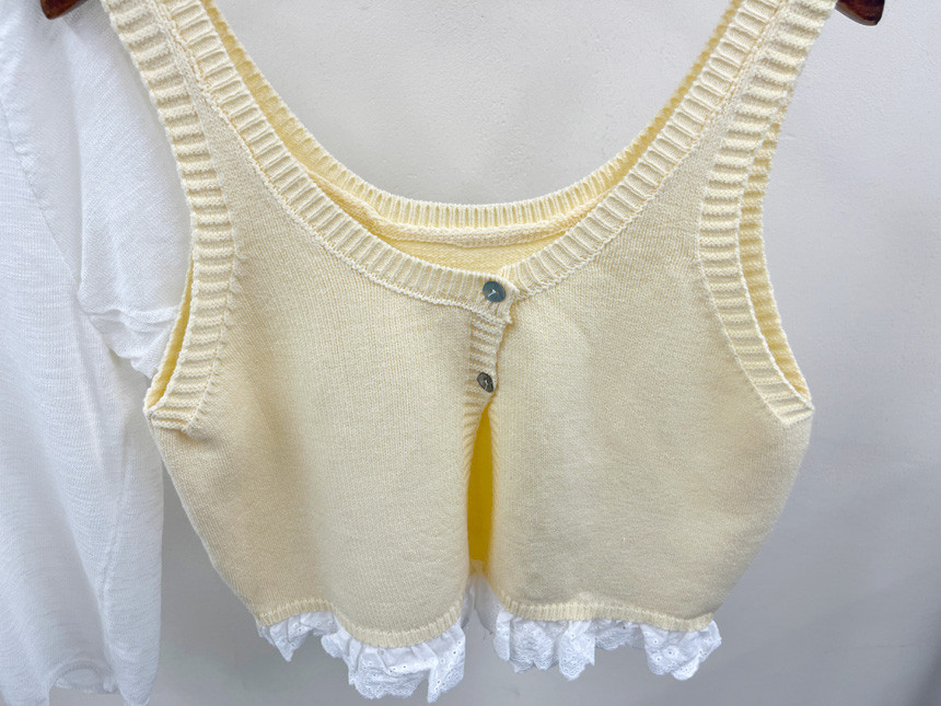 베스트는 크롭 기장에 밑단의 펀칭 레이스 포인트가 더해져
