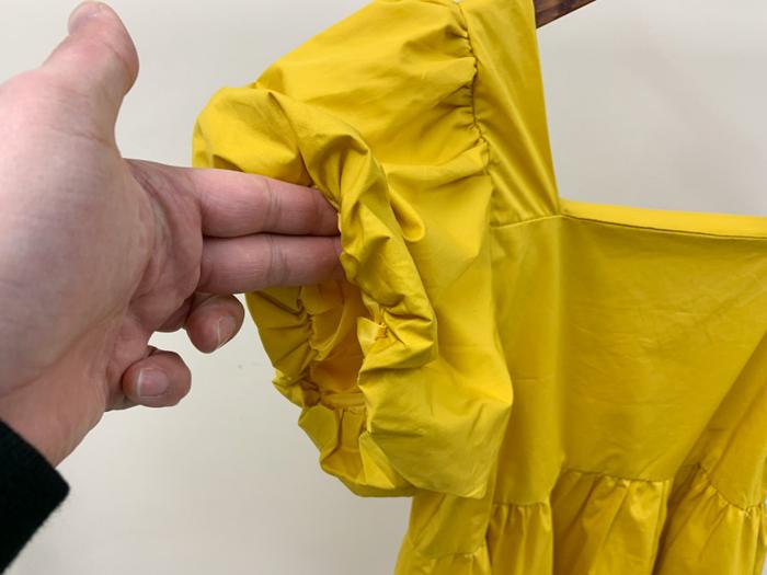 어깨 퍼프 디테일로 얼굴이 작아보이고 팔뚝을 커버해주어 더욱 날씬하게 연출되며