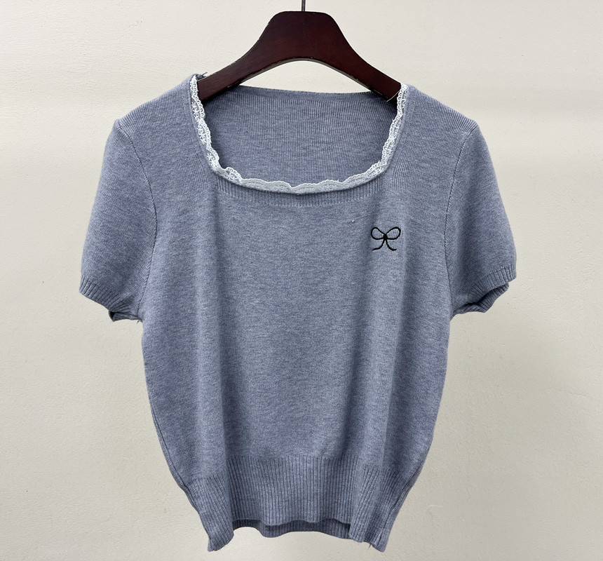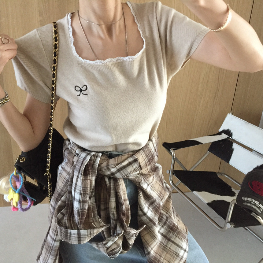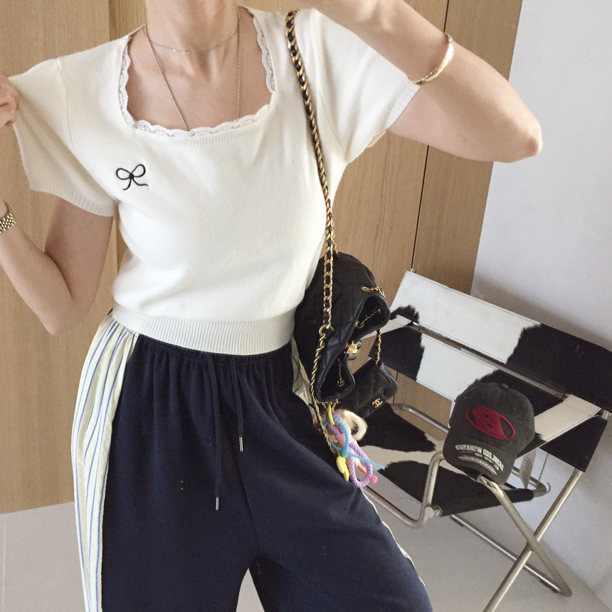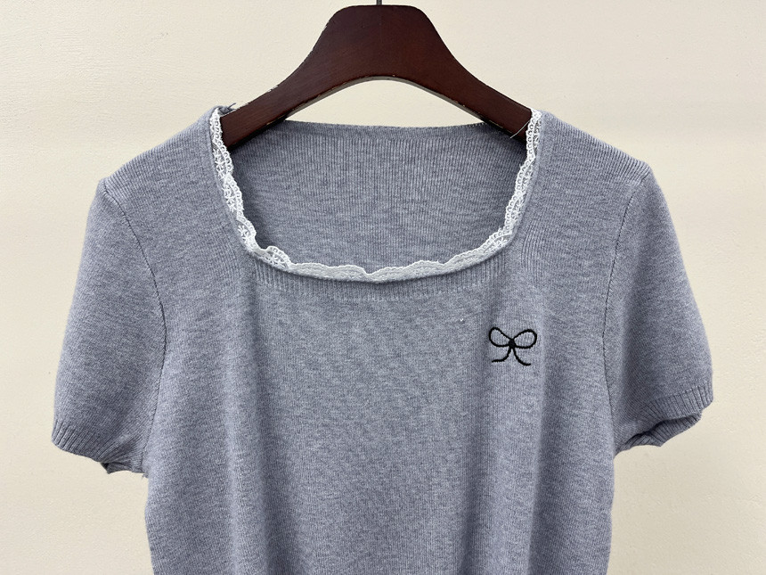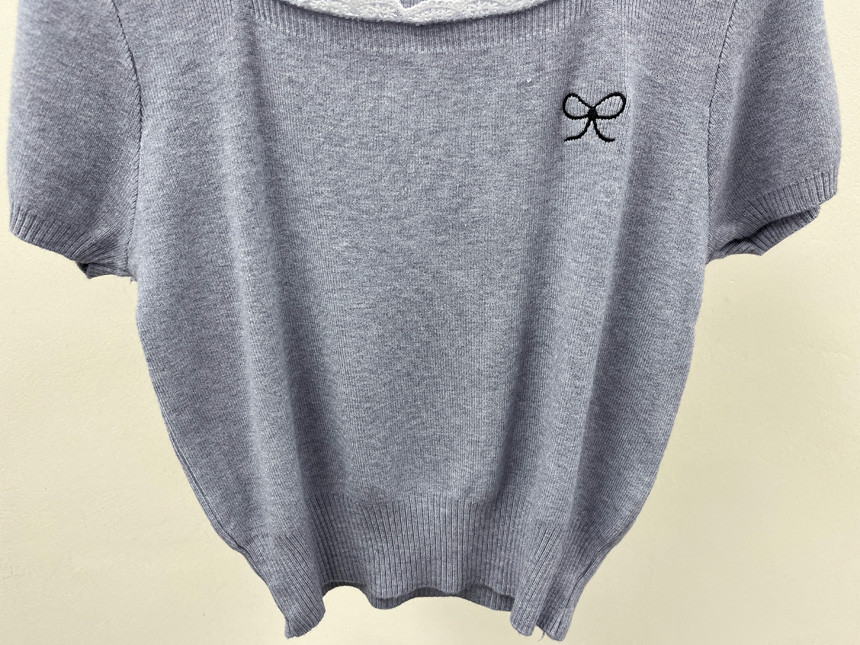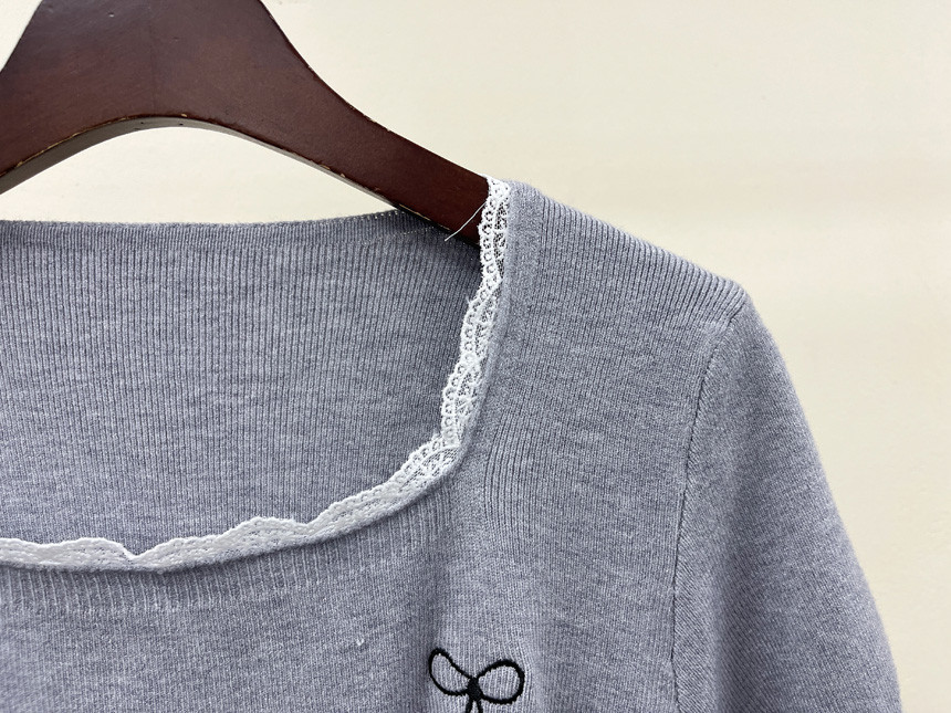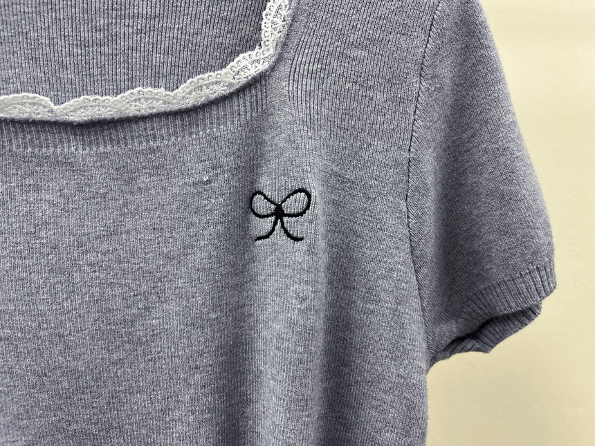 레이스 리본자수 스퀘어넥 반팔니트 소개드려요 ><