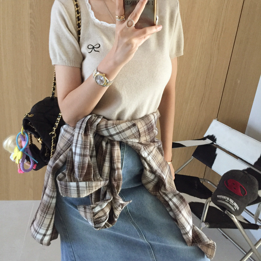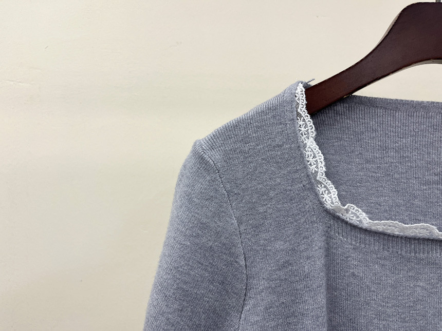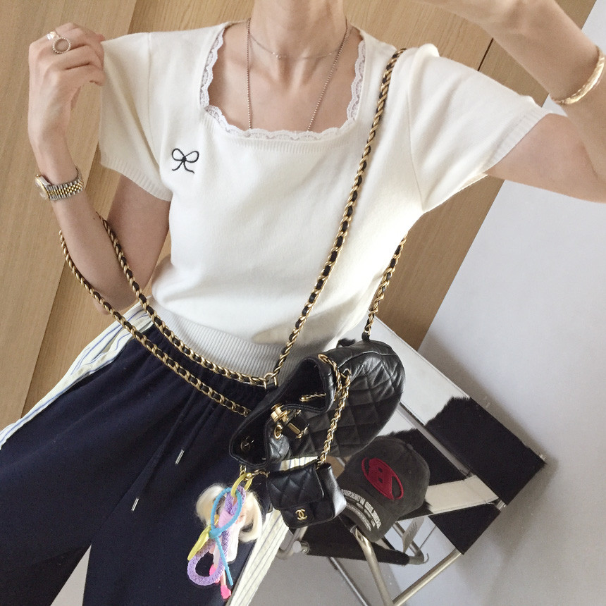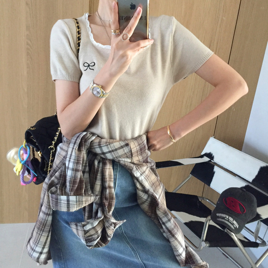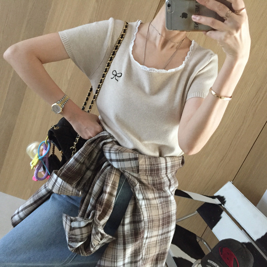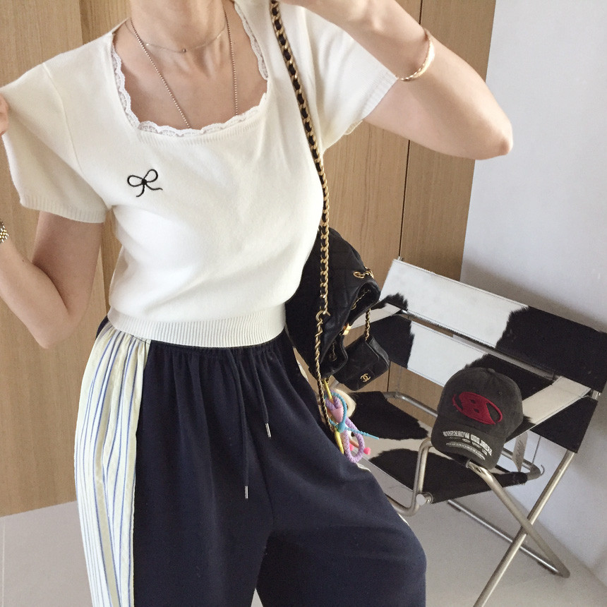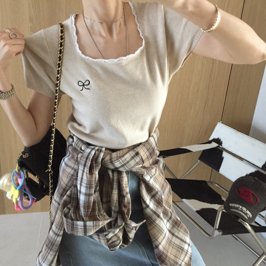 레이스 리본자수 스퀘어넥 반팔니트 소개드려요 ><