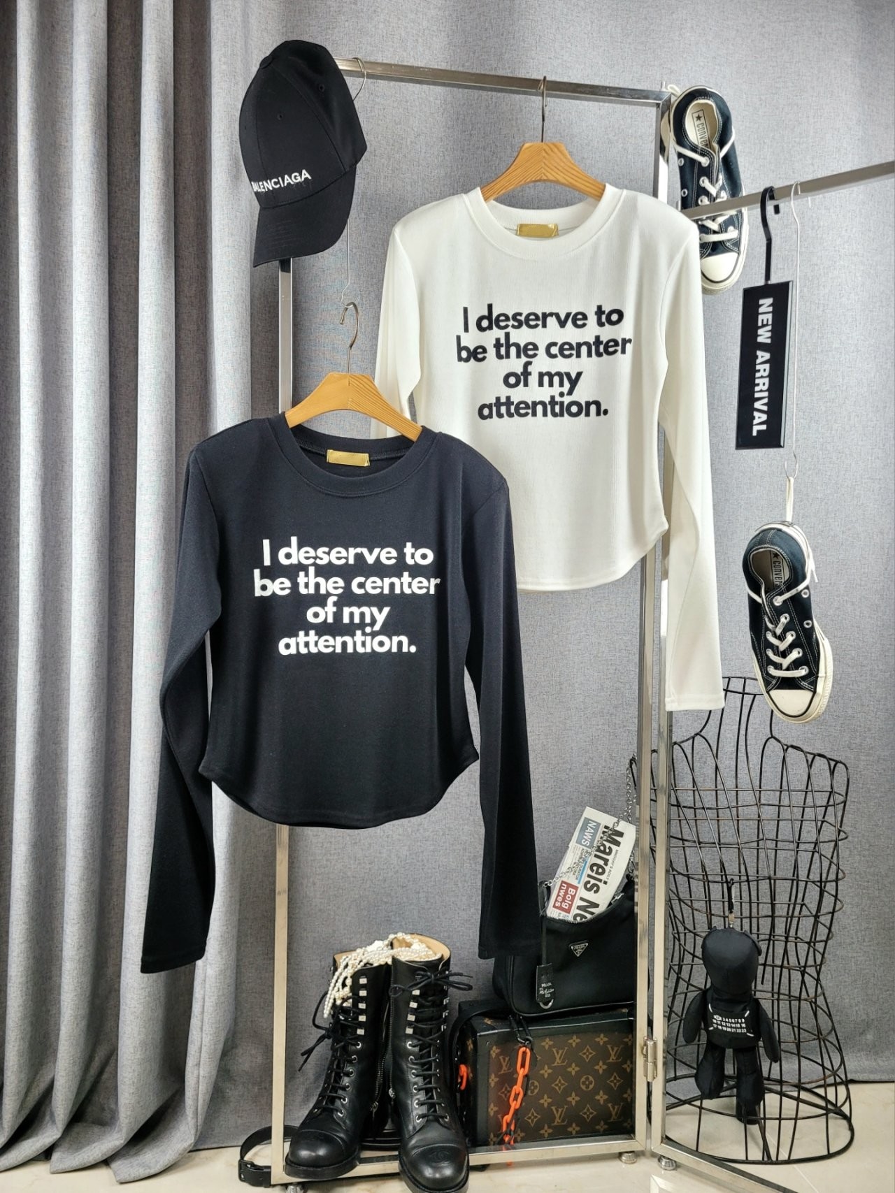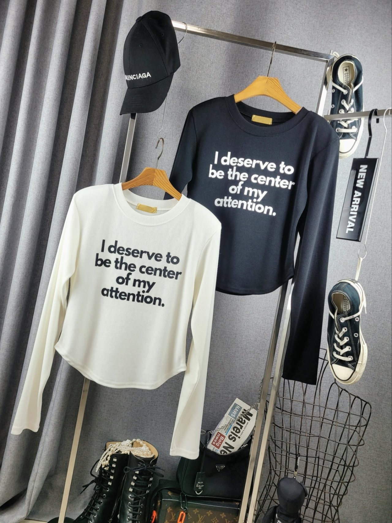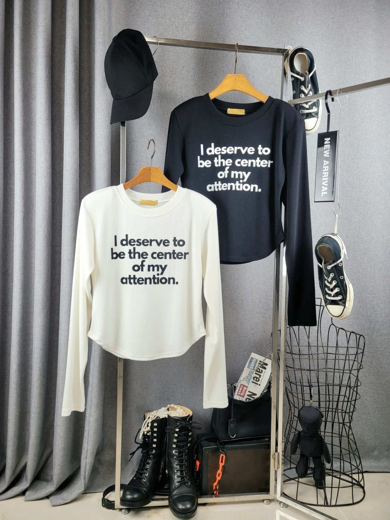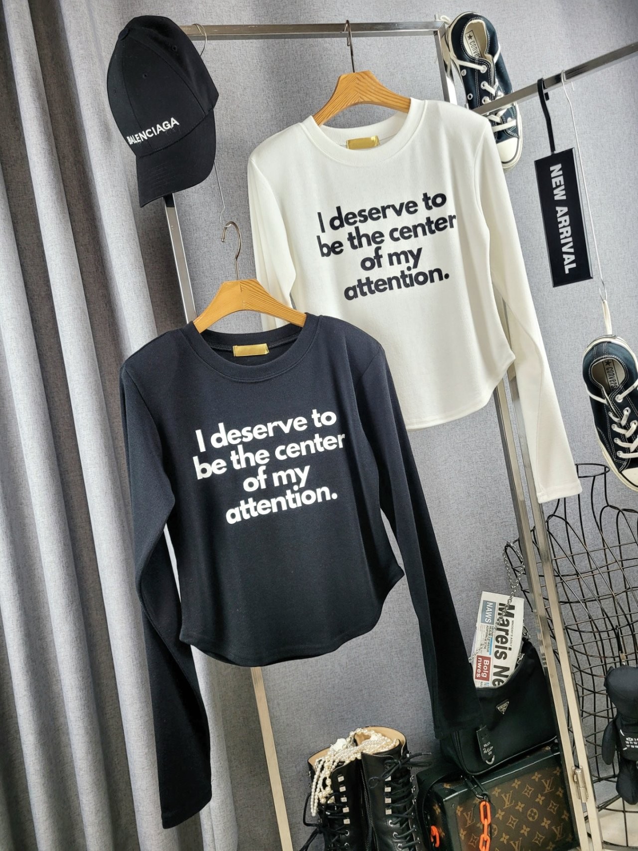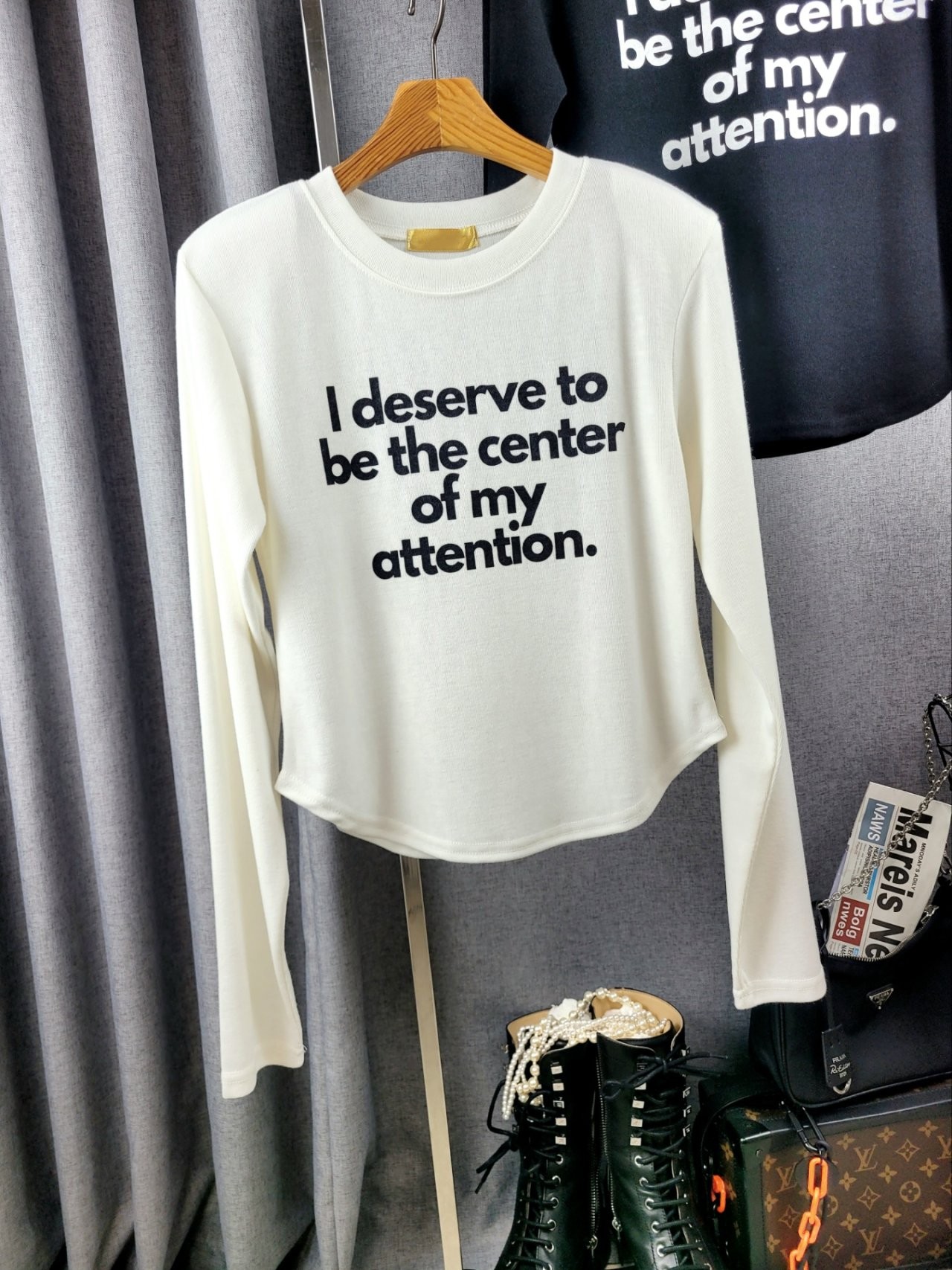 포인트를 톡톡히 더한 긴팔 티셔츠에요
