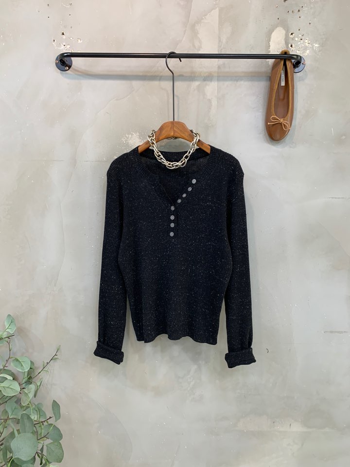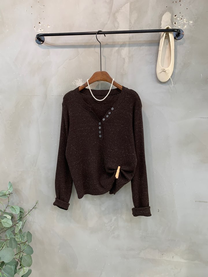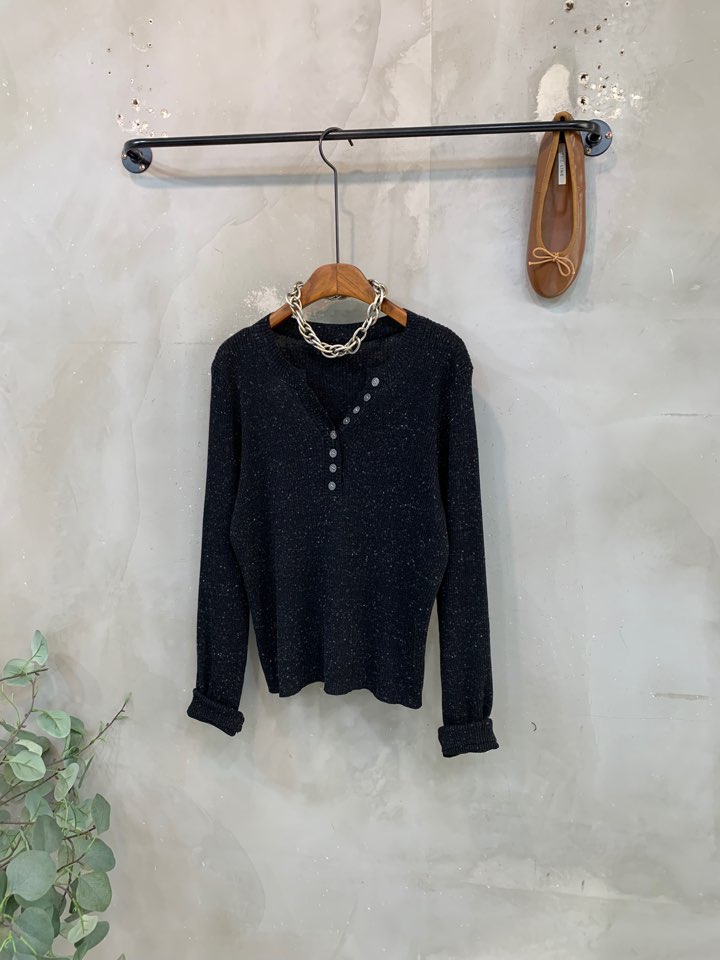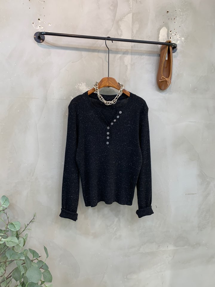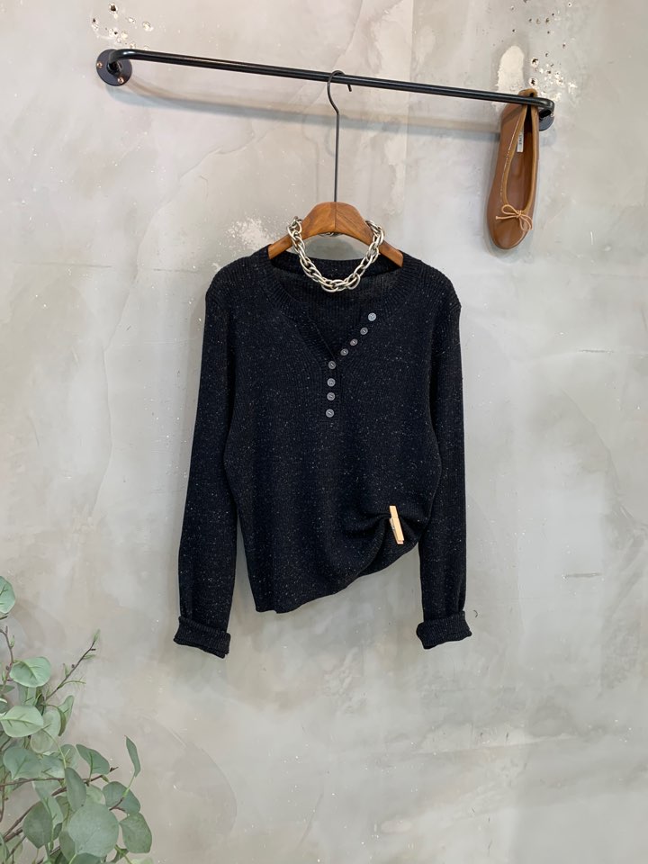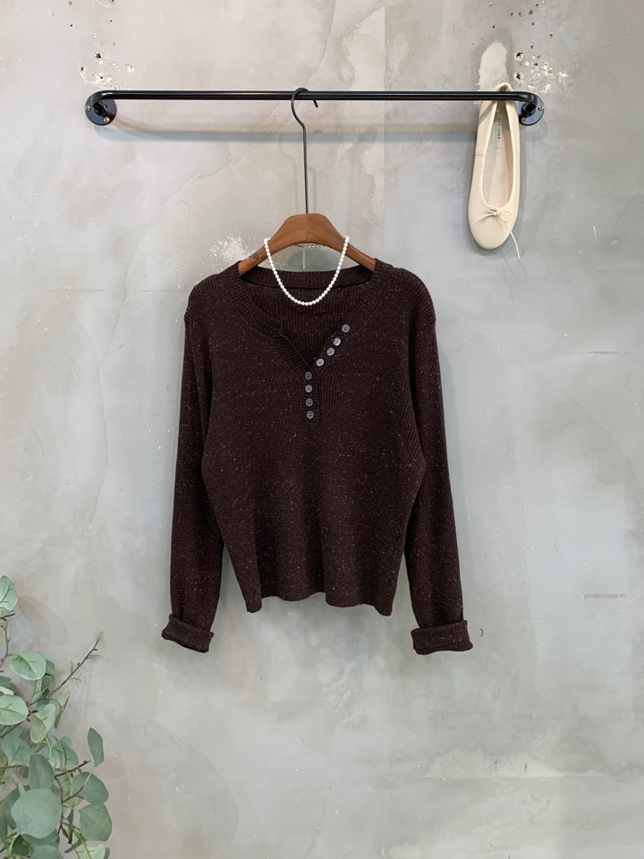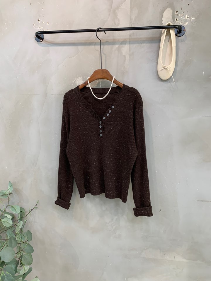 V자 슬릿넥 라인을 따라 배열 된 버튼 디테일이