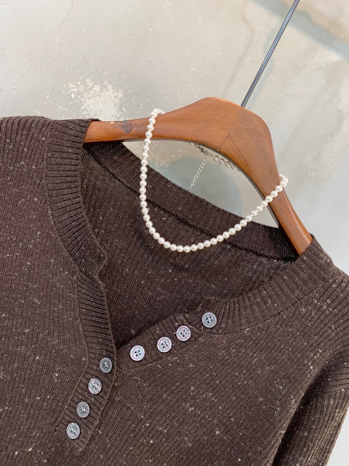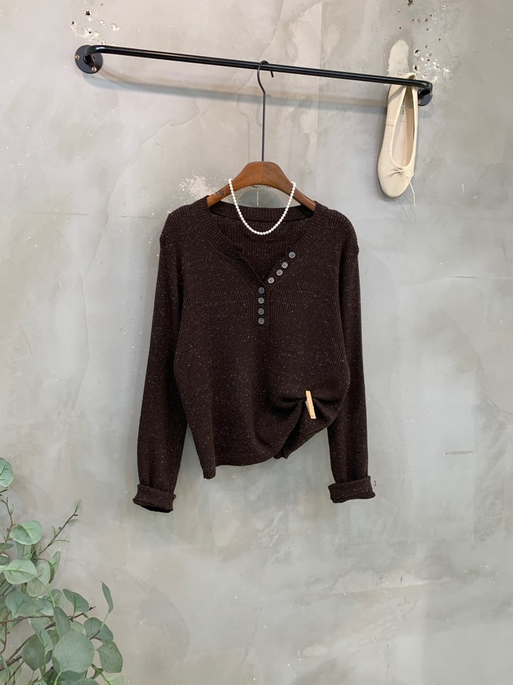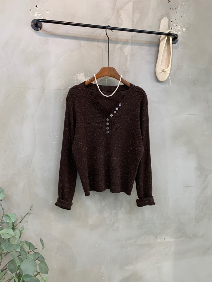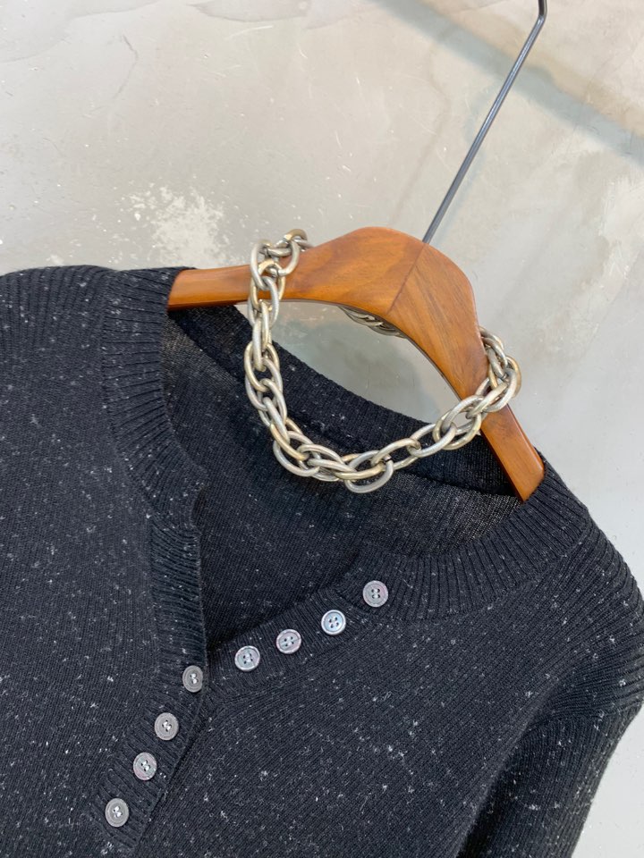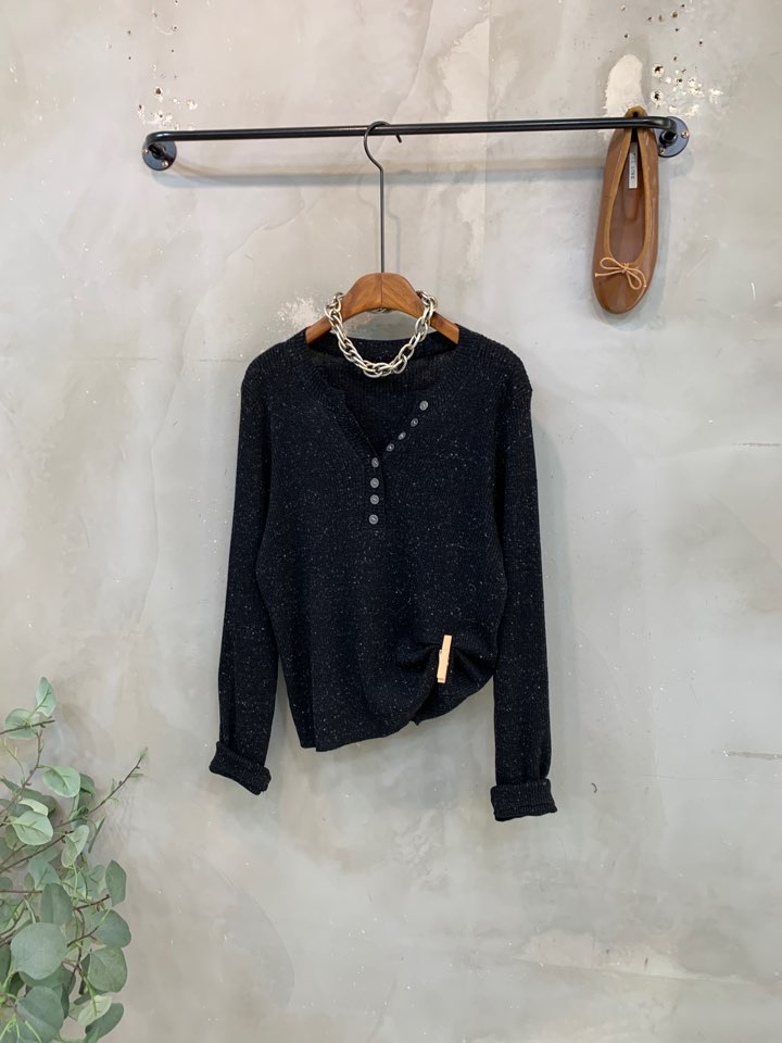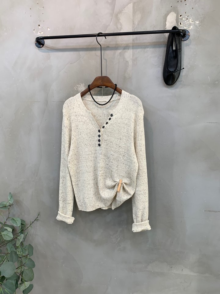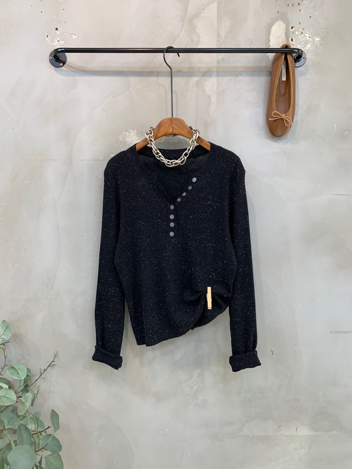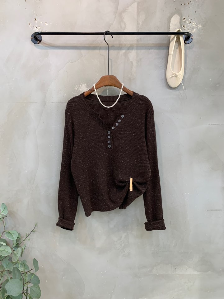 V자 슬릿넥 라인을 따라 배열 된 버튼 디테일이