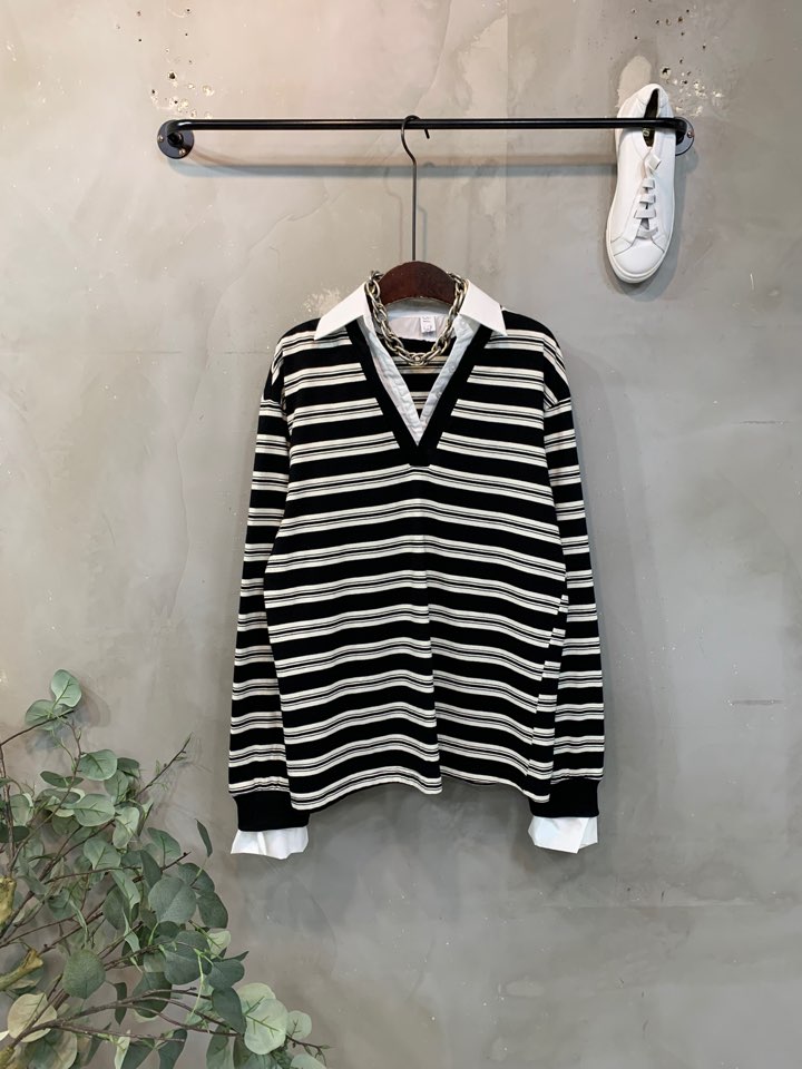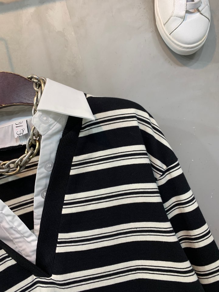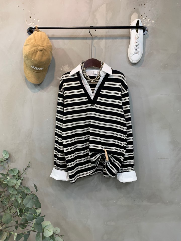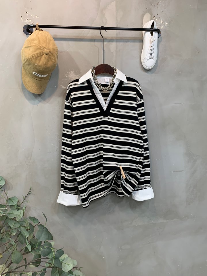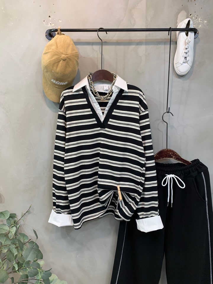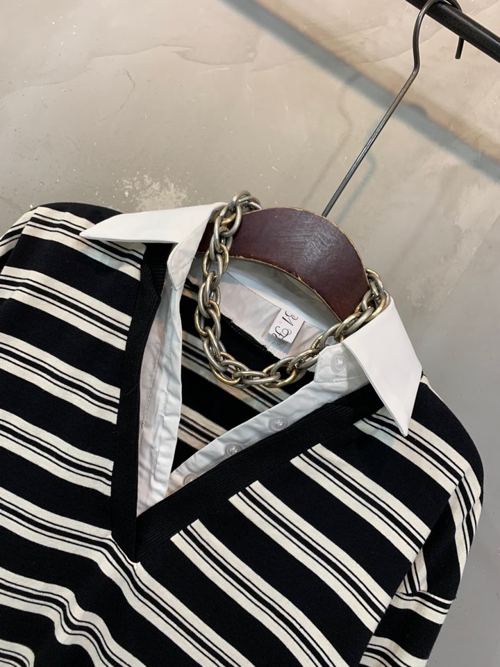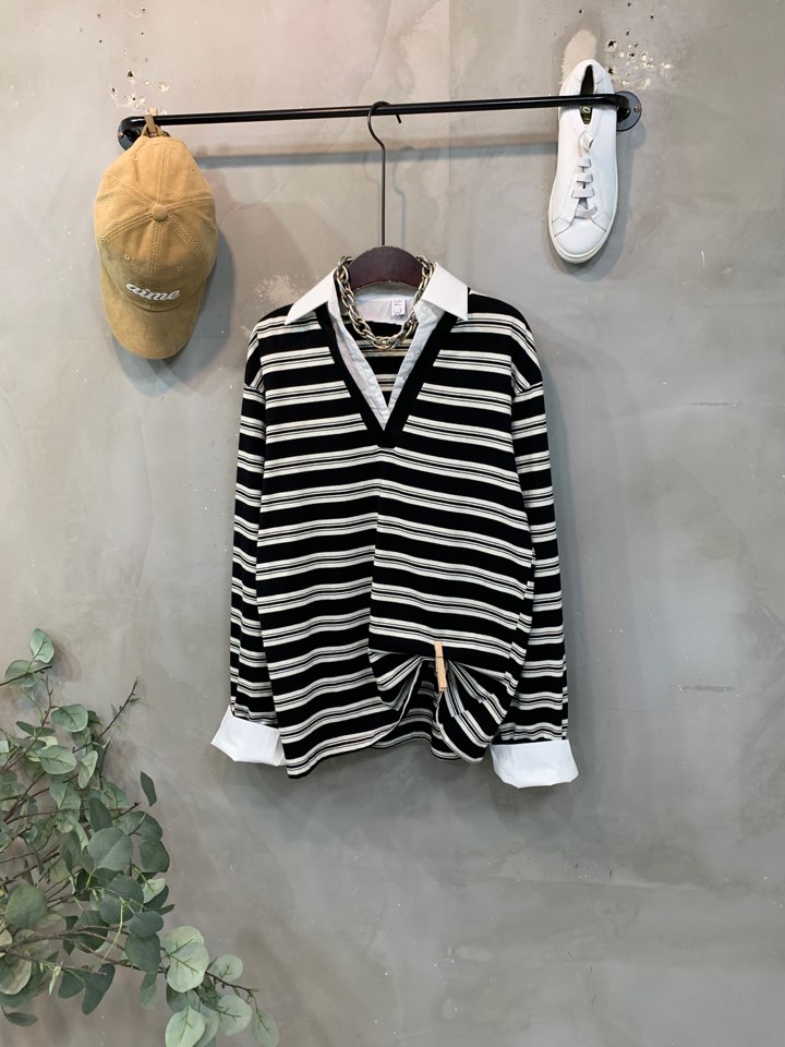 브이넥 라인 안쪽으로 셔츠를 레이어드해서