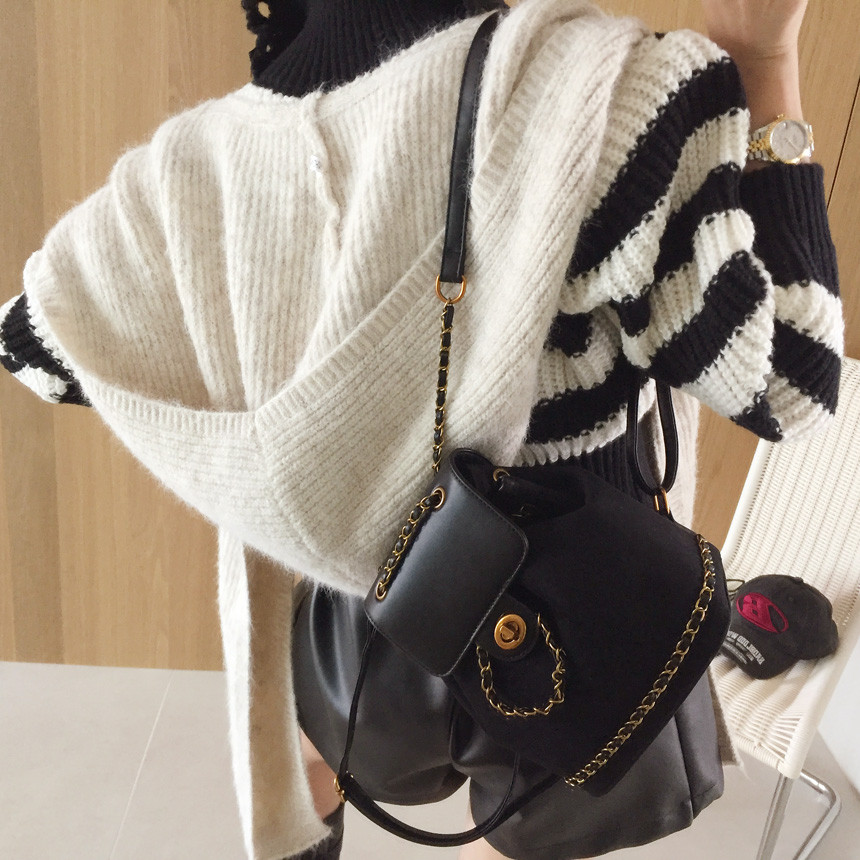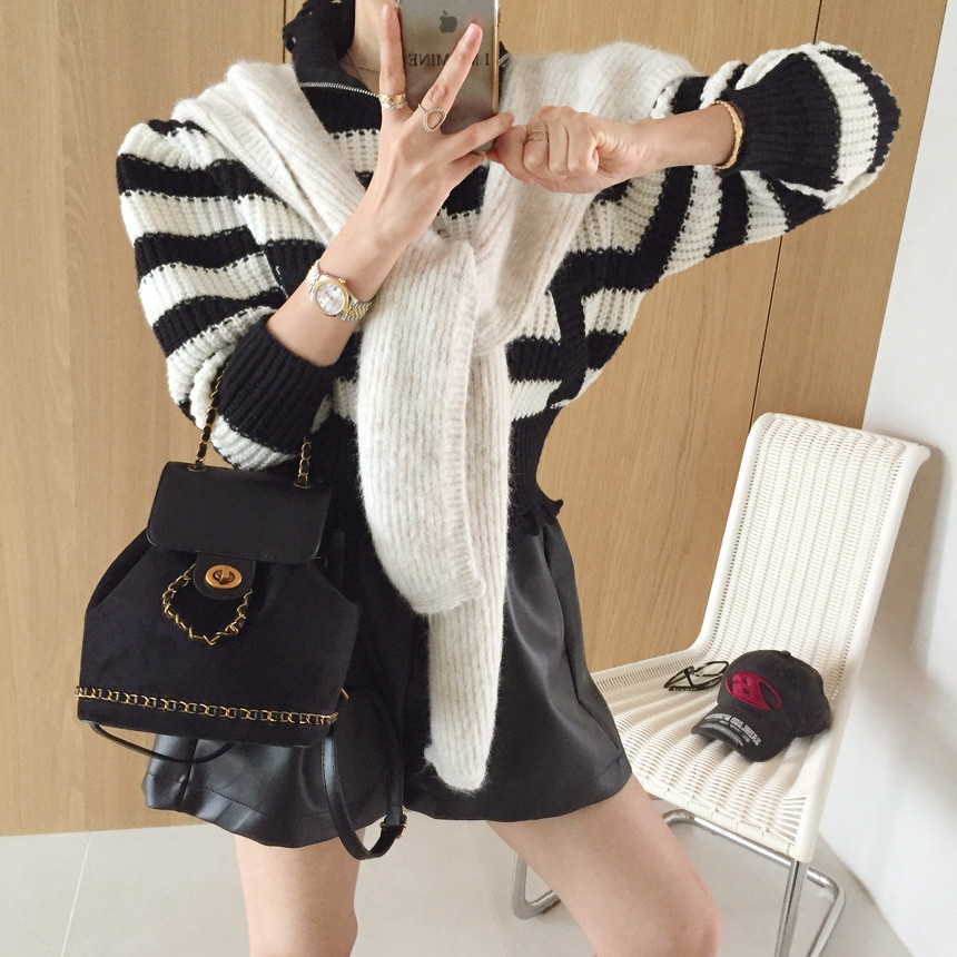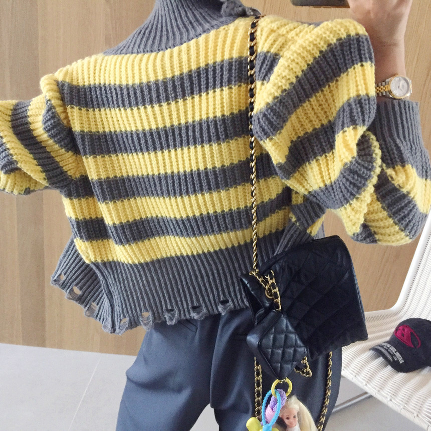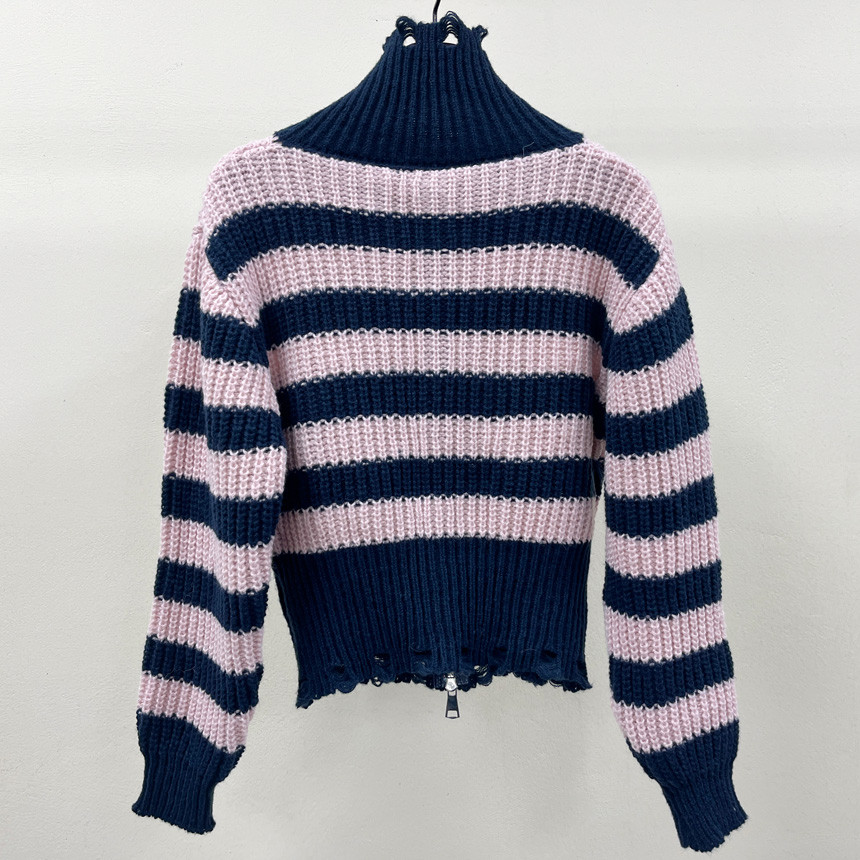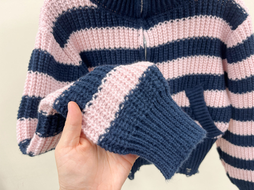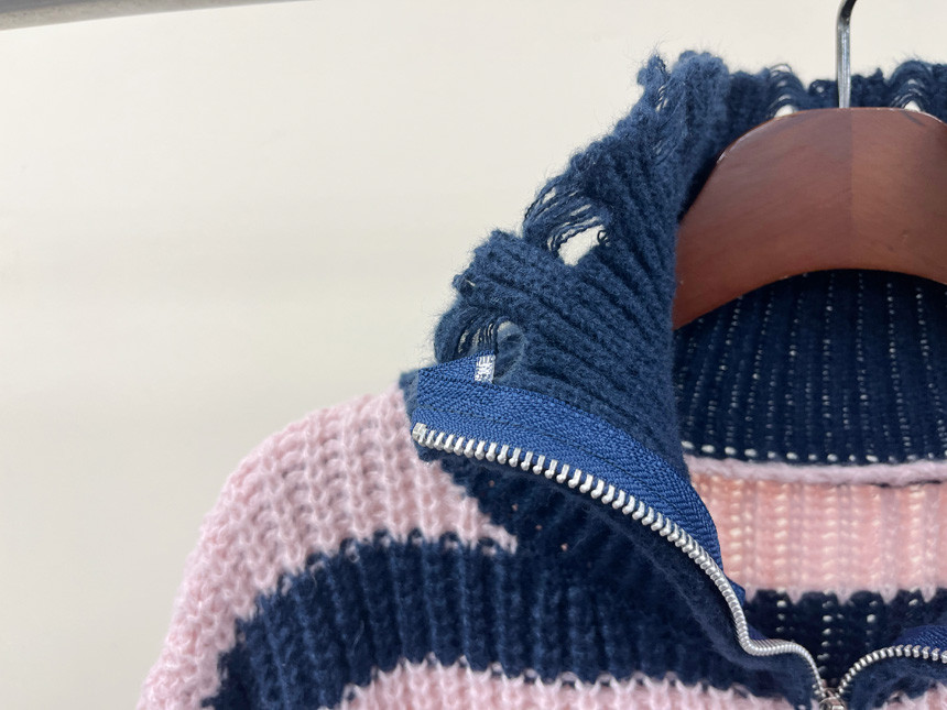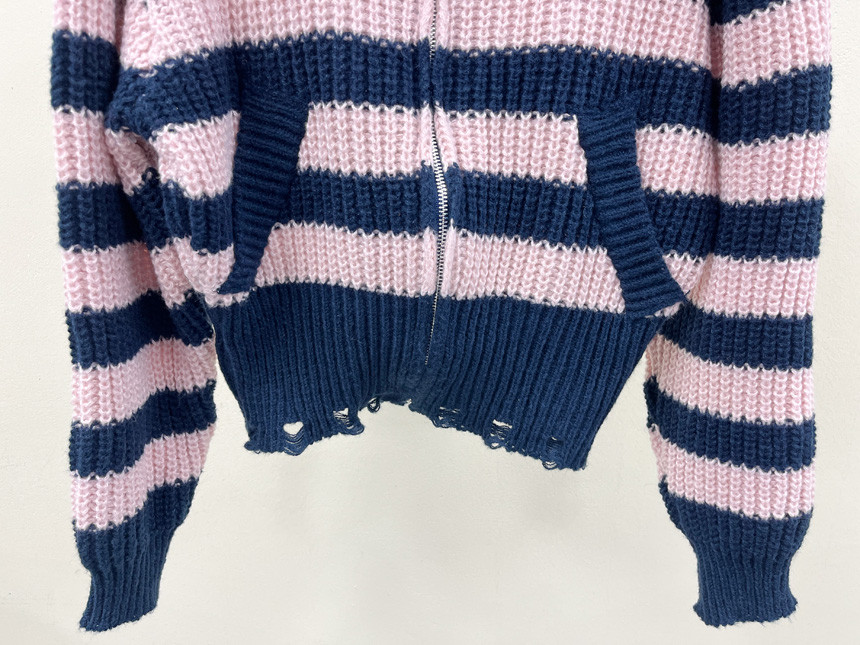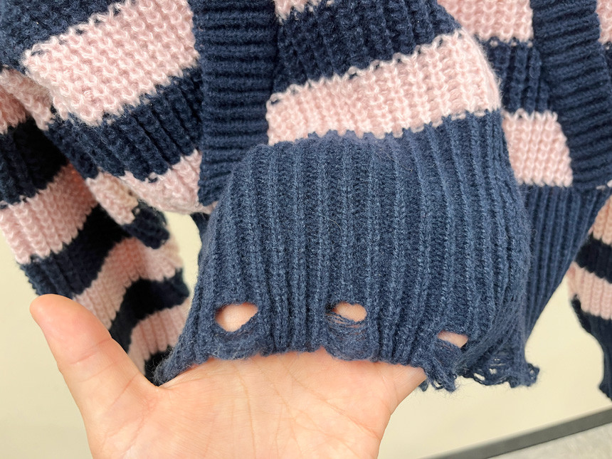 스트라이프 패턴에 넥라인, 밑단의 헤짐 펀칭 디테일로
