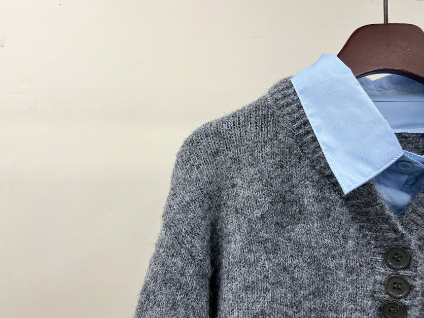 셔츠에 니트가 레이어드 된듯 세련된 무드의